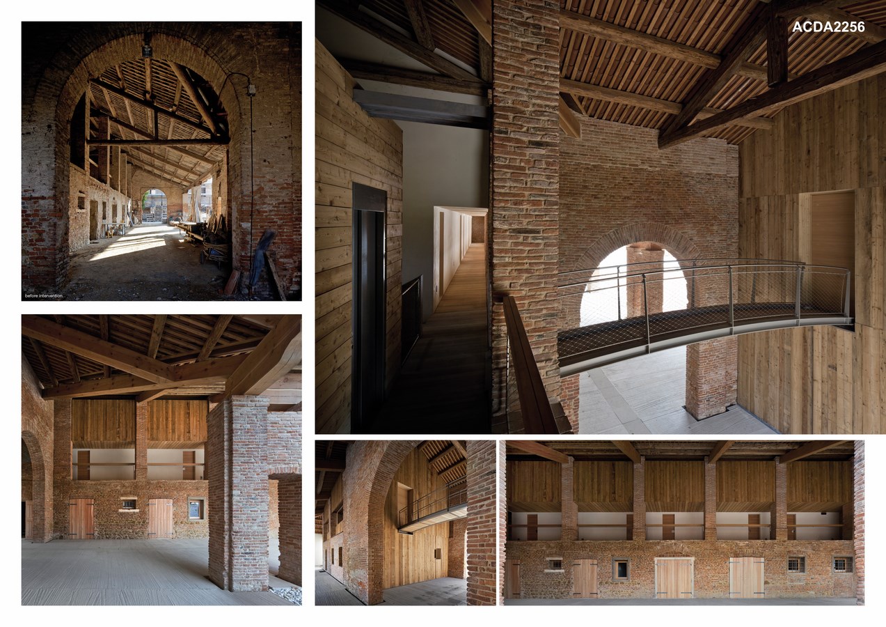 The techniques involved in the prefabrication of light construction elements were carried through the renovation of the historic buildings of the courtyard, linking the intervention to a concept of reversibility and respect of the existing structures: entirely prefabricated CLT cells were inserted into the large nineteenth century ‘barchessa’, acting as living spaces of the bed and breakfast. The new cells, set upon a steel structure on the ground floor, form the new, earthquake proof skeleton of the brick building.