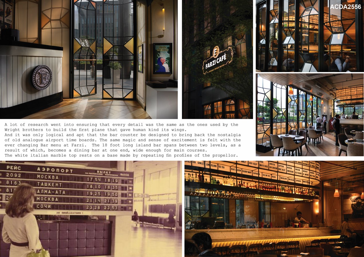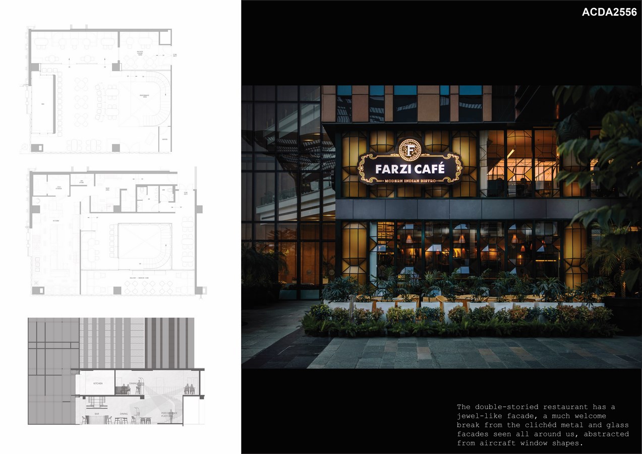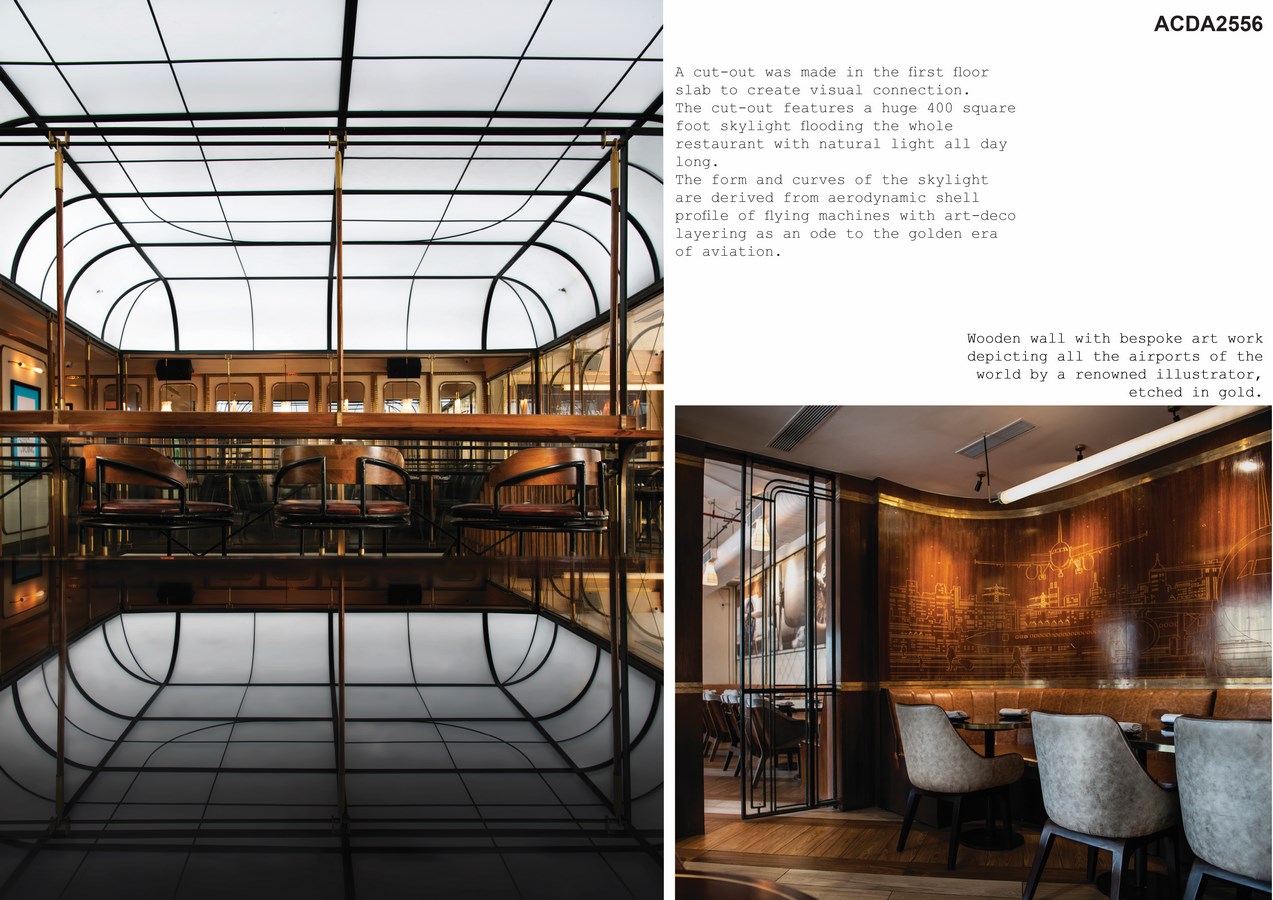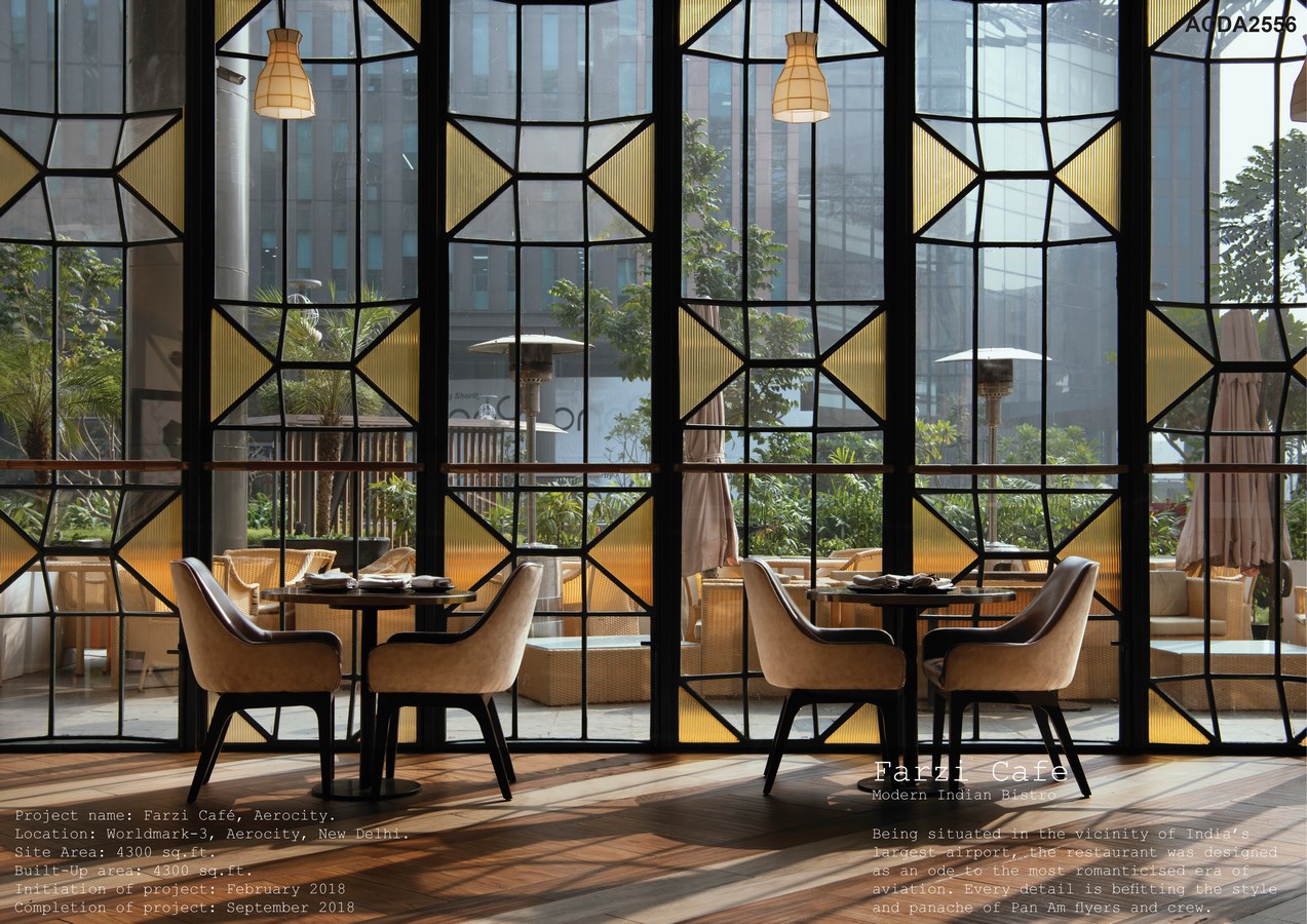 Being situated in the vicinity of India’s largest airport, the restaurant was designed as an ode to the most romanticised era of aviation. Every detail is befitting the style and panache of Pan Am flyers and crew. The double-storied restaurant has a jewel-like facade, a much welcome break from the clichรฉd metal and glass facades seen all around us, abstracted from aircraft window shapes.
