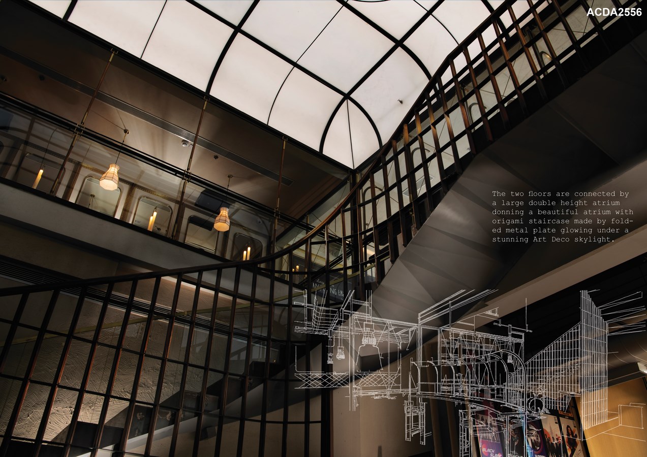 The two floors are connected by a large double height atrium donning a beautiful atrium with origami staircase made by folded metal plate glowing under a stunning Art Deco skylight.