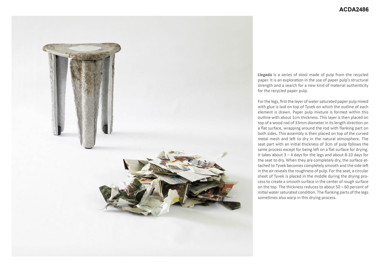 Llegado is a series of stool made of pulp from the recycled paper. It is an exploration in the use of paper pulp’s structural strength and a search for a new kind of material authenticity for the recycled paper pulp.
