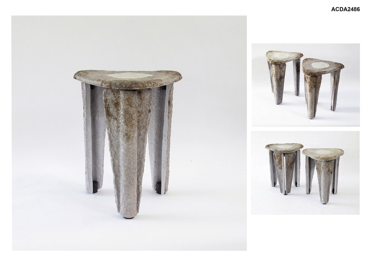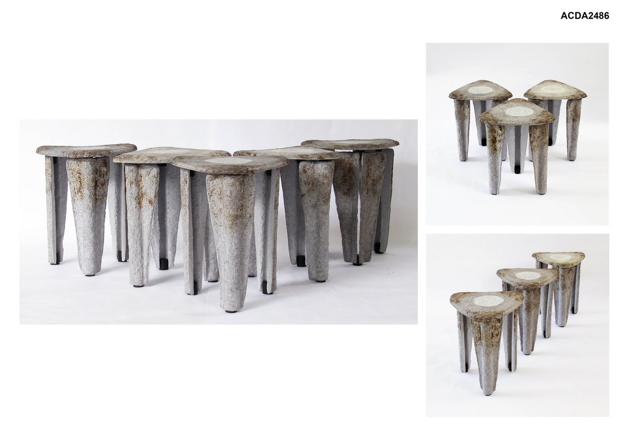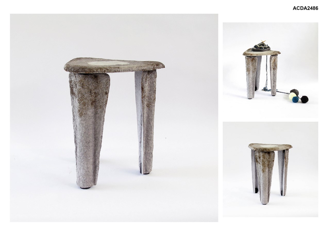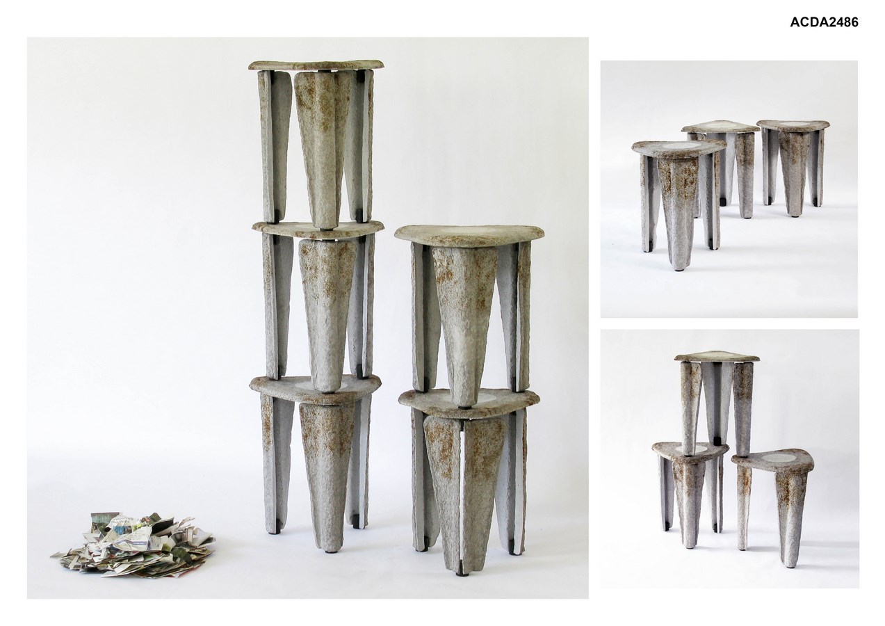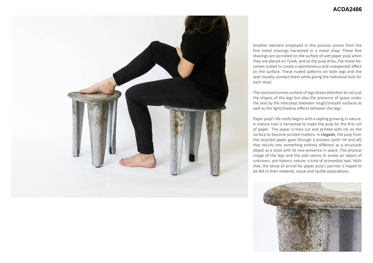 Paper pulp’s life really begins with a sapling growing in nature. A mature tree is harvested to make the pulp for the first roll of paper. The paper is then cut and printed with ink on the surface to become printed matters. In Llegado, the pulp from the recycled paper goes through a process (with ink and all) that results into something entirely different as a structural object as a stool with its new presence in space. The physical image of the legs and the seat seems to evoke an object of unknown, pre-historic nature; a kind of primordial tool. With that, the sense of arrival for paper pulp’s journey is hoped to be felt in their material, visual and tactile associations.