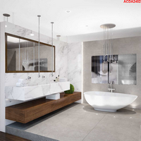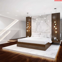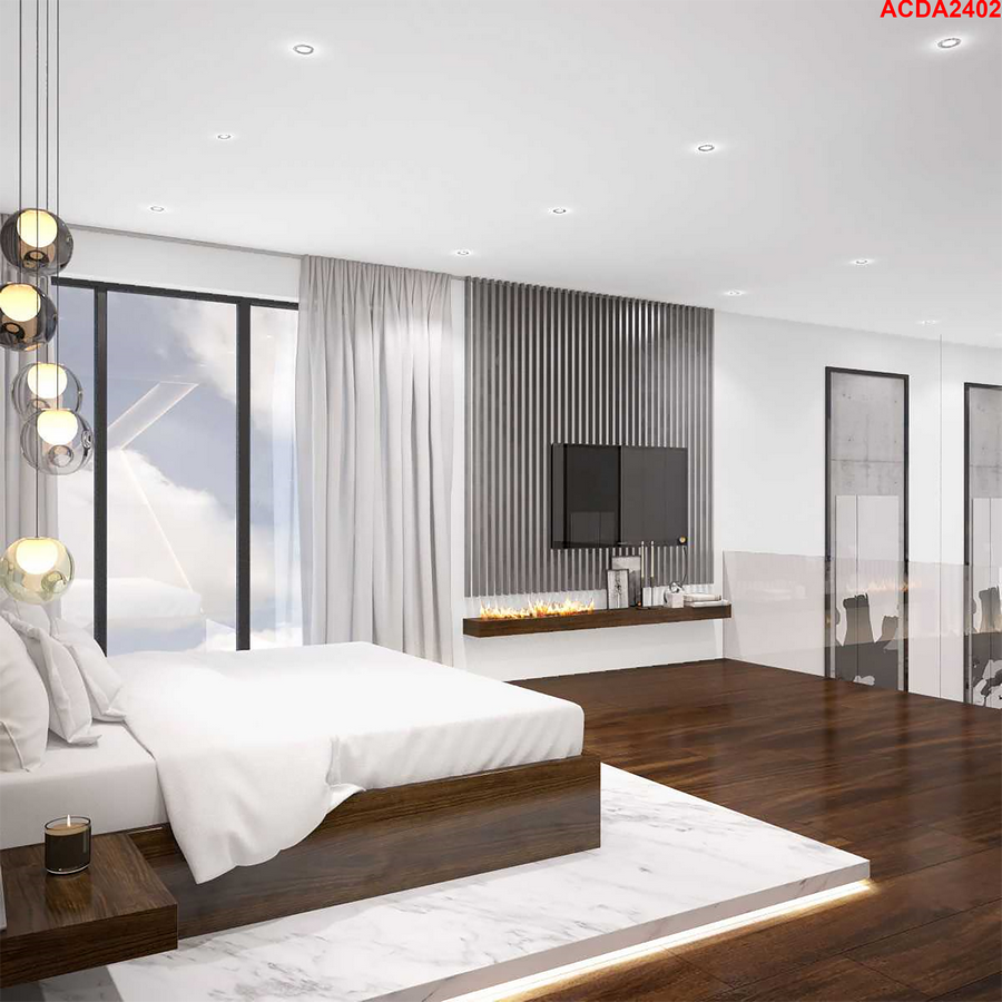 The master suite constitutes the entire second floor. It overlooks the living room, separated only by a glass railing. The bed is custom constructed, on a Calcutta marble platform, which appears to be floating. Integrated night-tables complete the minimalistic hotel vibe. The TV unit incorporates a sleek linear fireplace creating a stunning focal point. A wall hung bar flawlessly completes this serene suite.