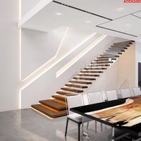 The home showcases a completely open floor plan. Soaring ceilings, floor to ceiling windows, a floating staircase, and polished concrete floors were the base elements that the design was built upon. While the body of the home is super minimalistic many other architectural features were integrated to add texture, vibrancy, and passion.