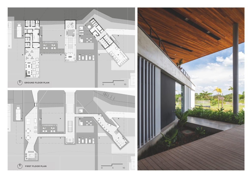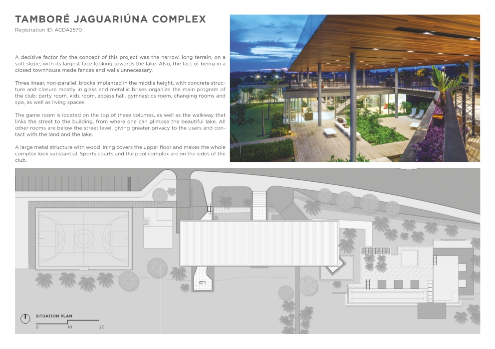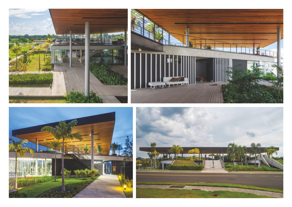Three linear, non-parallel, blocks implanted in the middle height, with concrete structure and closure mostly in glass and metallic brises organize the main program of the club: party room, kids room, access hall, gymnastics room, changing rooms and spa, as well as living spaces.
