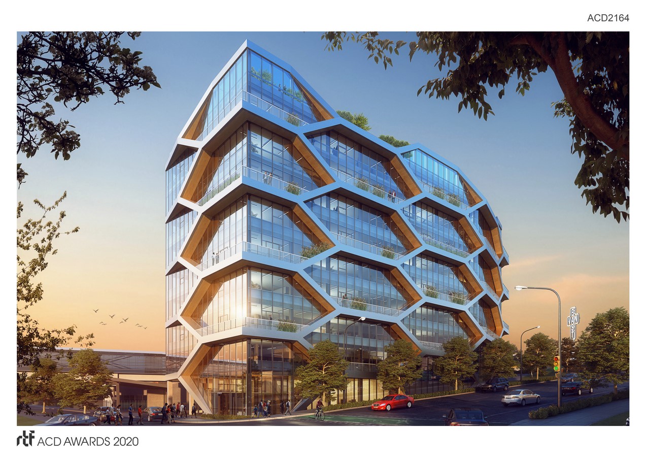 Keith Drive’s overall design has been significantly informed by three main factors. First, the sloping, narrow site on which it will be located, as well as a series of right-of-ways, greatly restrict the building’s footprint. Second, there was a deliberate move to free up the inside floor plates by situating the building’s structural system – a mass timber seismic bracing system that uses Tectonus steel and rubber connections at structural junctions – on the perimeter of the building; this is expressed architecturally on the exterior as a honeycomb-shaped exoskeleton. Third, the design team made a conscious effort to respect the East Van cross when determining massing and setbacks.