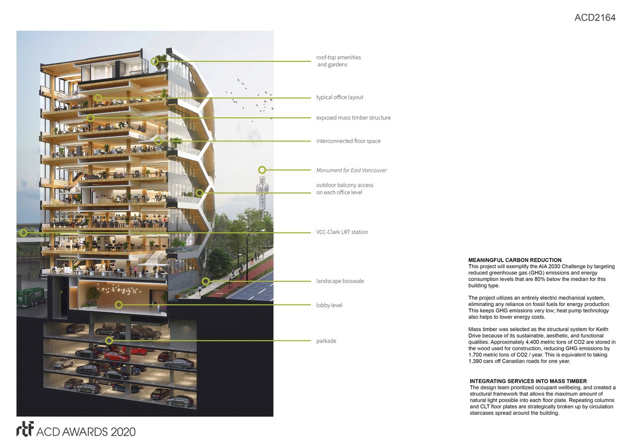 2150 Keith Drive is a 164,000 sq ft, 10-storey mass timber office building that will be built in Vancouver’s False Creek Flats area. The building will be located on the spiritual, cultural, and symbolic east-west divide between the city’s downtown core and East Vancouver, a historically diverse working class neighbourhood. It will also be immediately adjacent to a public art piece titled Monument for East Vancouver. The East Van cross, as it is known colloquially, was erected in 2010 and has since been adopted as a city icon.