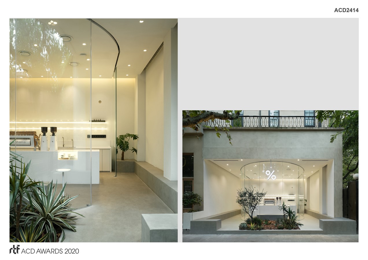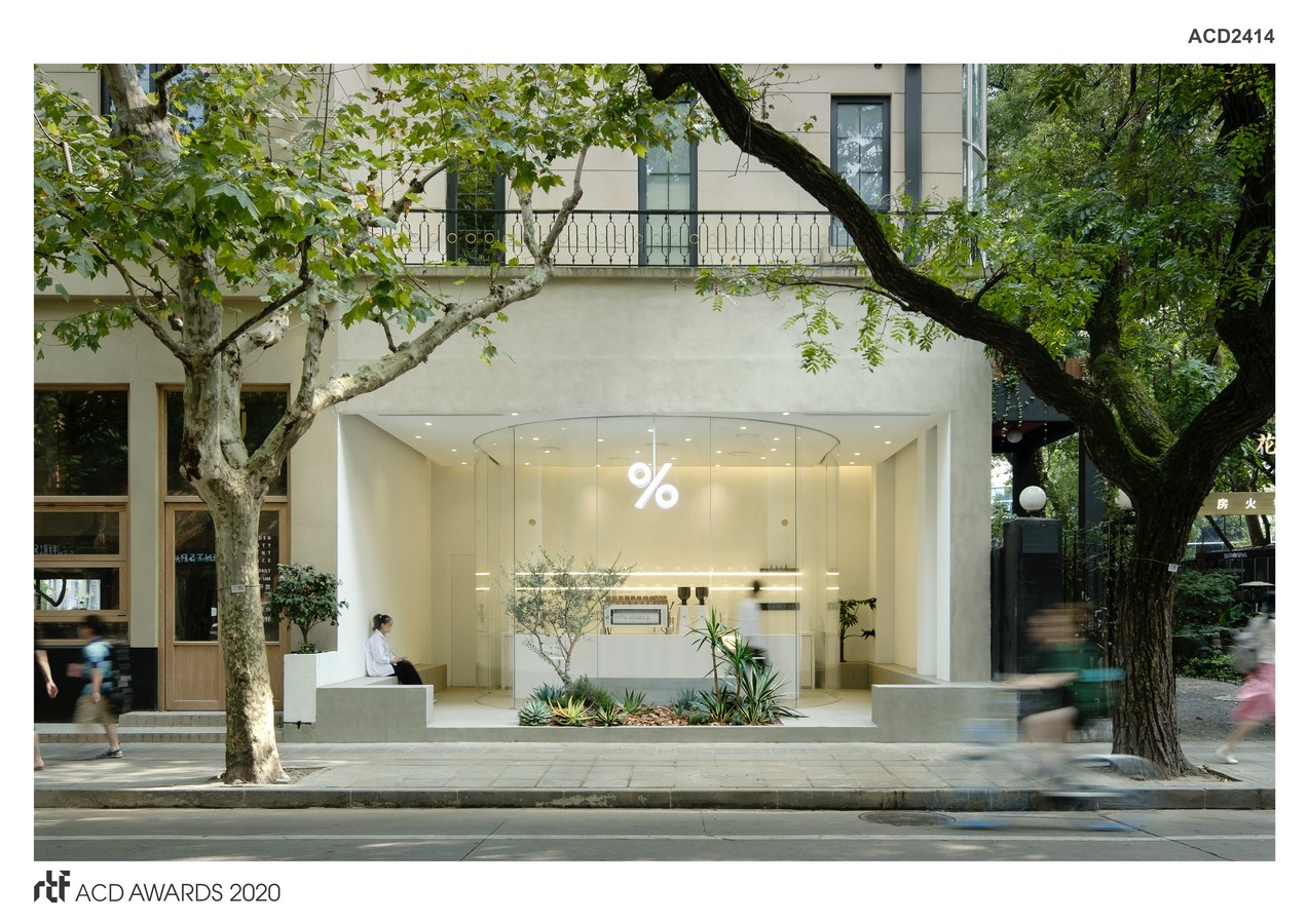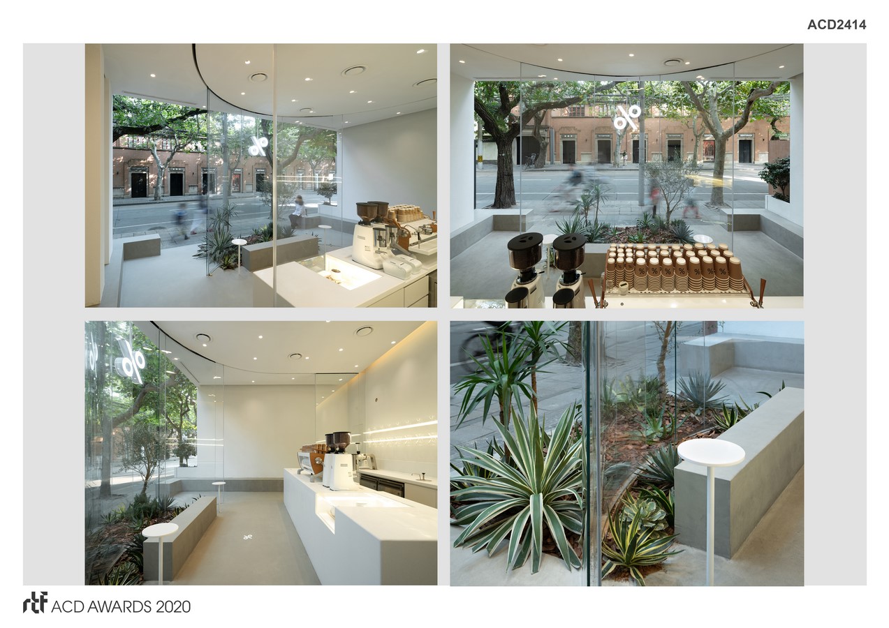 The overall transparent, open and welcoming design helps the coffee shop blend into the urban context and the streetscape. Meanwhile, the design introduces street and urban scenery into the store: The parasol trees, marvelous changes of light and shadows, the crowd passing by – all become a significant part of the whole store. Through the vibrant dialogue with nature and urban streets, we redefine the boundaries between interior and exterior.