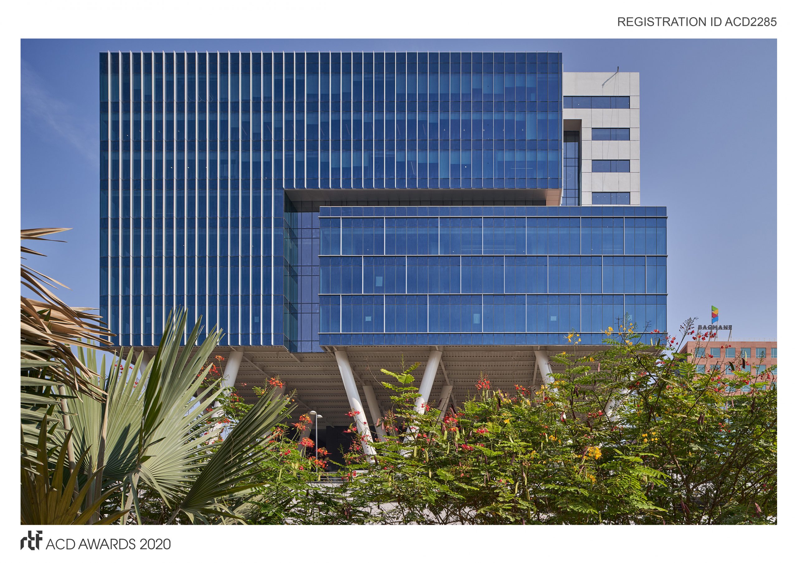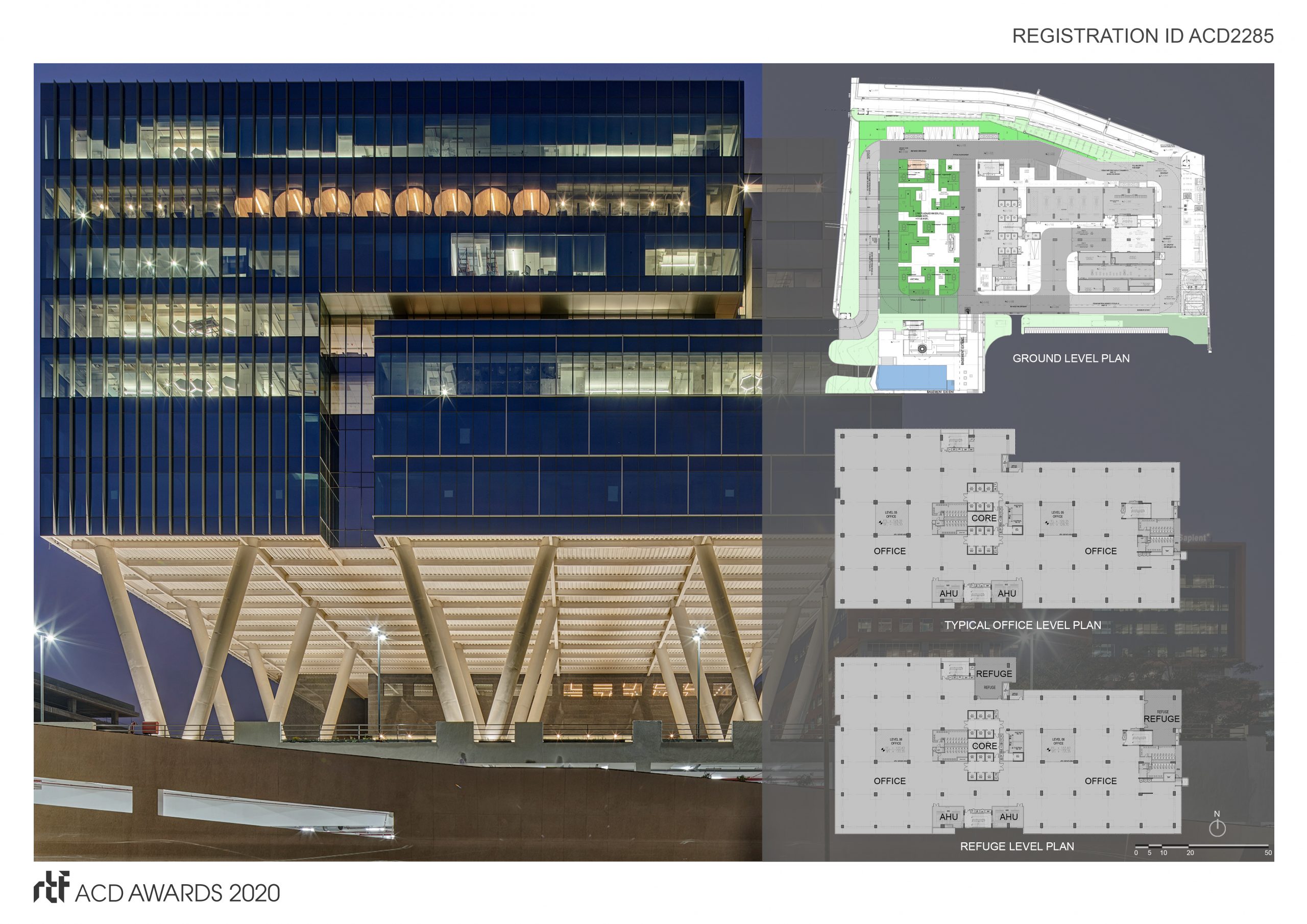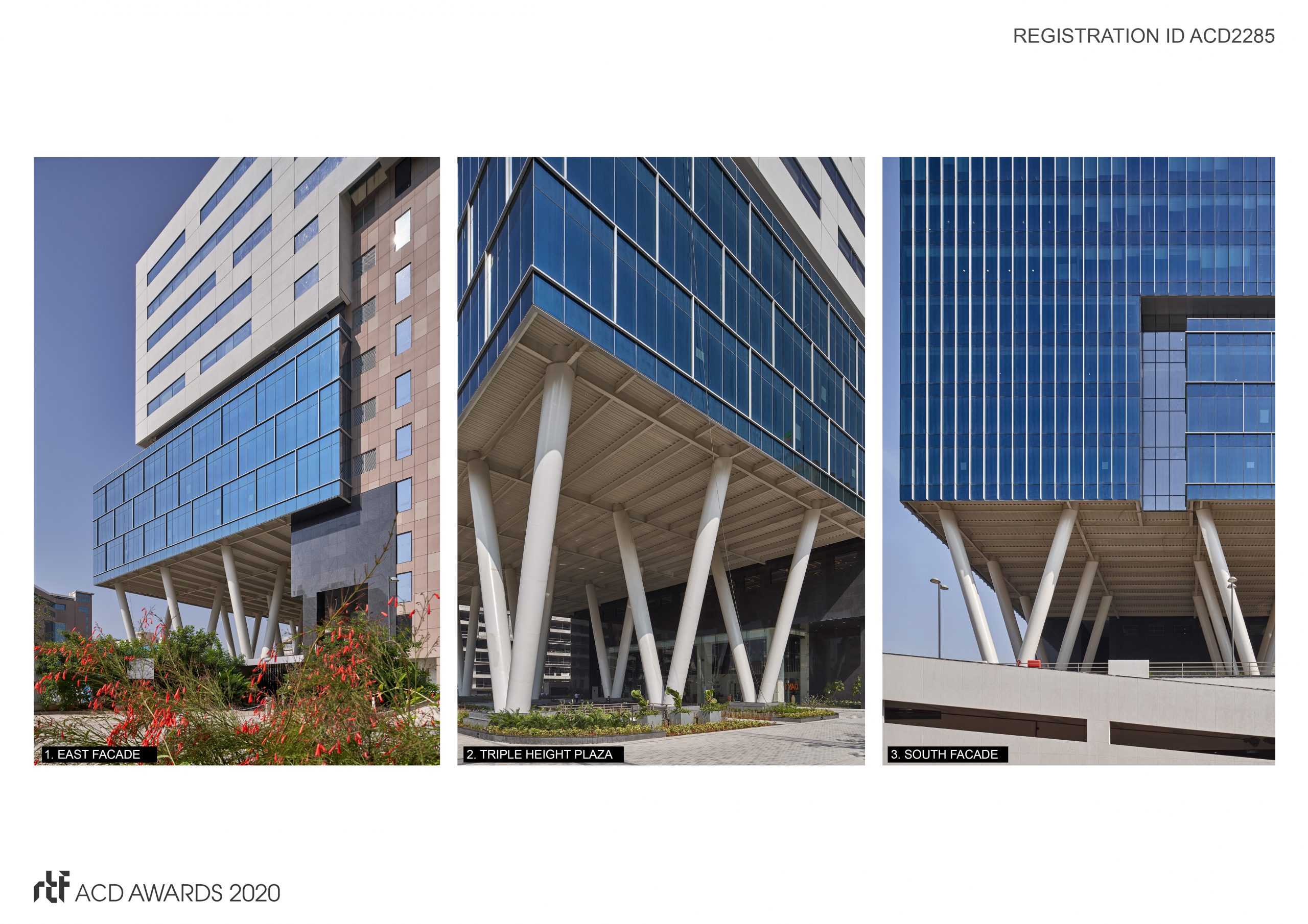 The massing is composed of interlocking boxes with the combination of masonry and glazed façade. Iconic V-columns, measuring 5 storeys, support the volume above the main entry and drop off area providing a grand experiential space with landscaped plaza. Due to the petrous terrain, the site could be delved up to one basement level, entailing the addition of stilts. The stilt levels served as a base to foreground the office floors.
