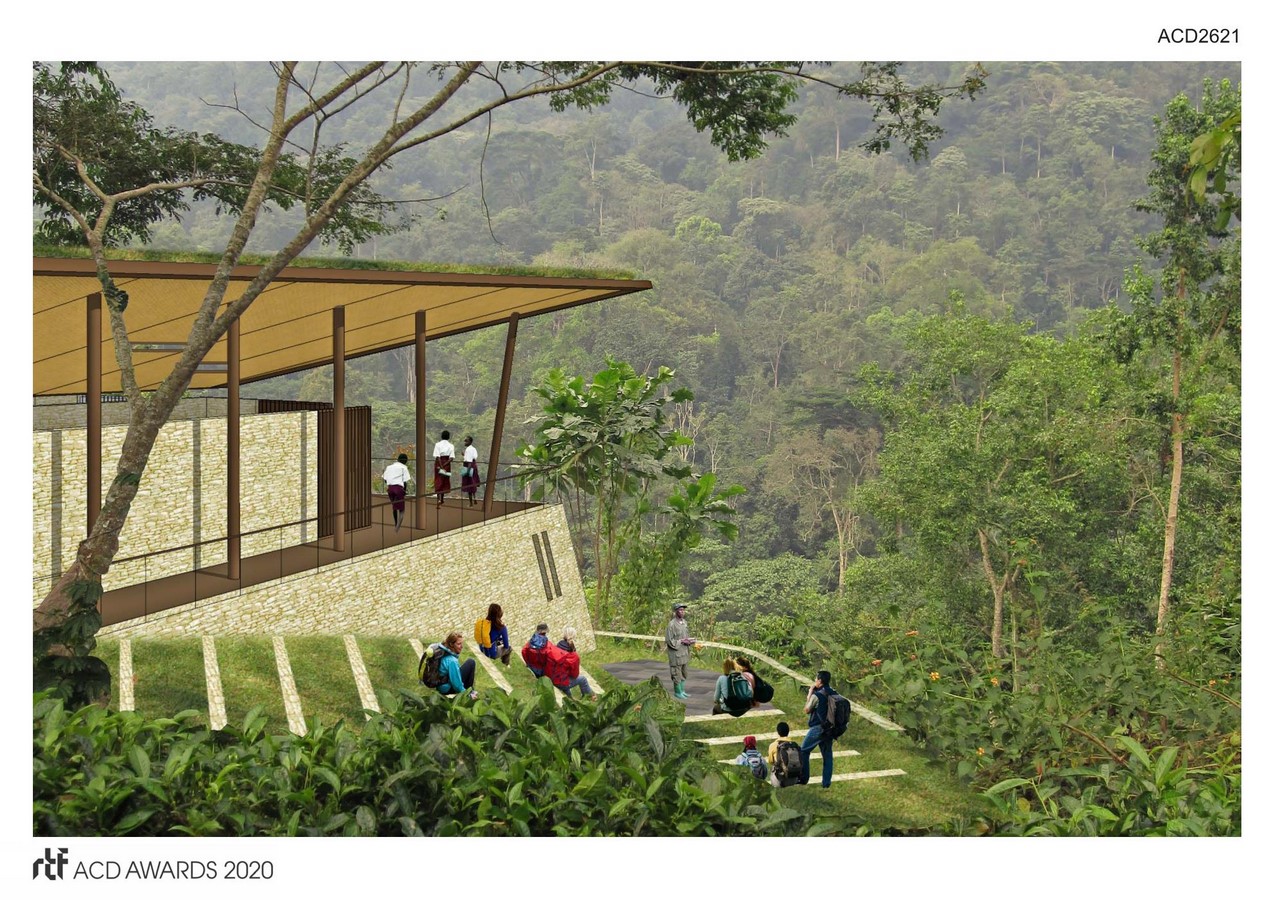 Built on a former cleared site containing a river and shared park boundary, the center will be a clear departure point for many activities in and around the park.  The buildings that make up the center are light, open, simple structures made with local and regional materials.  They are clustered to form comfortable indoor and outdoor spaces which intertwine with the landscape and facilitate the first and last stages of gorilla trekking.  The terraced rain gardens cascade down the hill as an expression of both the cultivated and the natural landscape.  Boardwalks traverse the site and reach out over the forested ravine to provide a tree canopy walk.