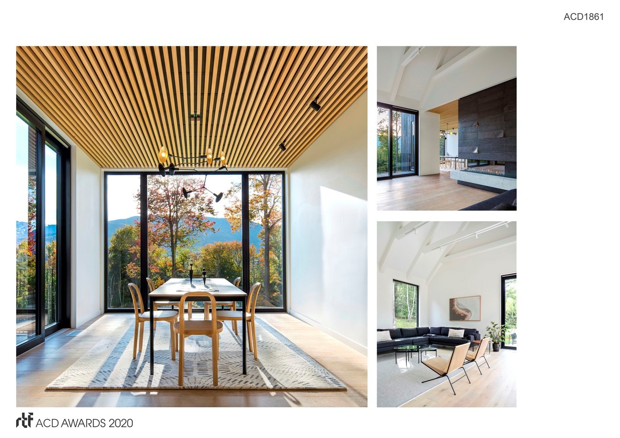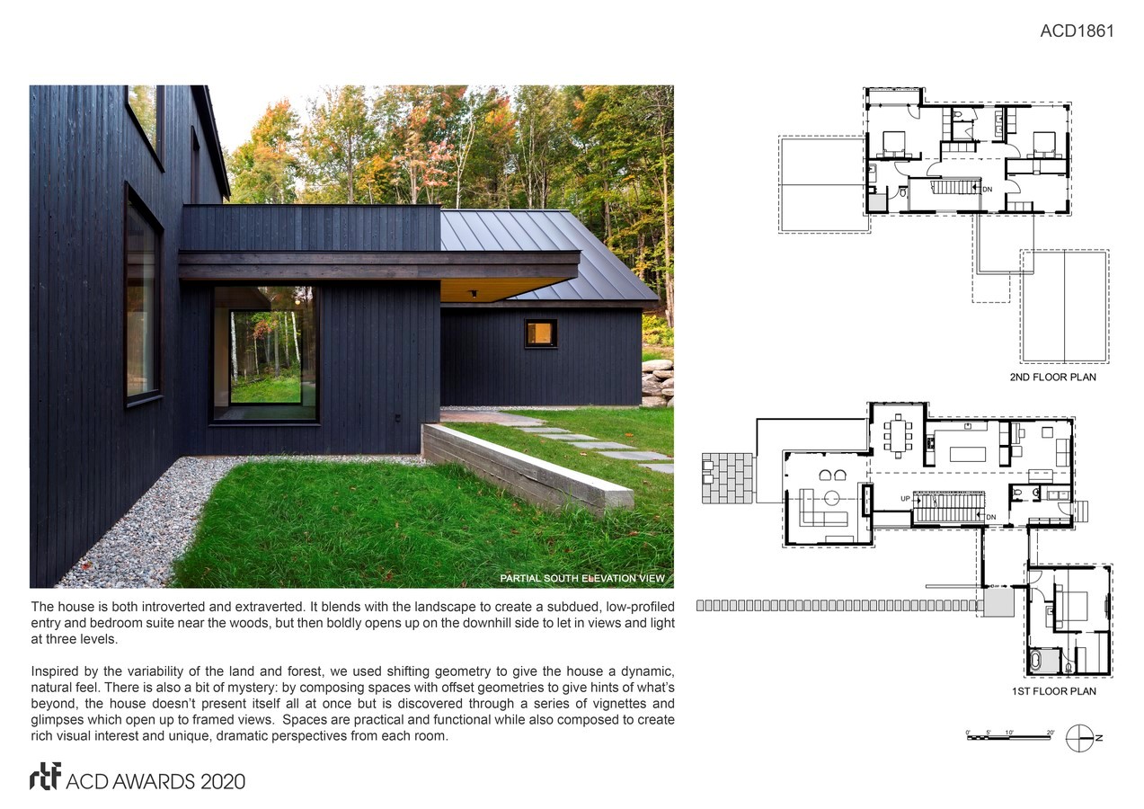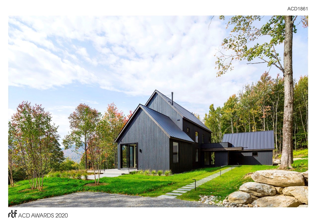 An ambition to implement an architecture that thoughtfully incorporated energy efficiency and low-maintenance construction led to a reimagining of the vanishing Vermont farmhouse as a vernacular building for the modern world. The house design and landscaping would be low-maintenance and unfussy. Our approach was to employ elemental architectural forms amid a lightly edited landscape. Two gabled volumes clad in charred and stained, almost-black siding wedge into the slope while a third volume nestles uphill to form an L-shaped plan linked by a glassy entry node. We located the house at woods’ edge where the varied terrain, long views and dense woods could all be appreciated, and fully integrated into the design.