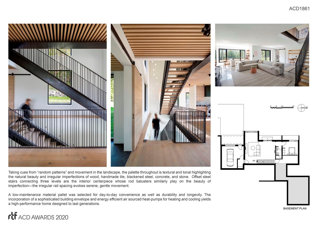 Taking cues from “random patterns” and movement in the landscape, the palette throughout is textural and tonal highlighting the natural beauty and irregular imperfections of wood, handmade tile, blackened steel, concrete, and stone. Offset steel stairs connecting three levels are the interior centerpiece whose rod balusters similarly play on the beauty of imperfection—the irregular rail spacing evokes serene, gentle movement.