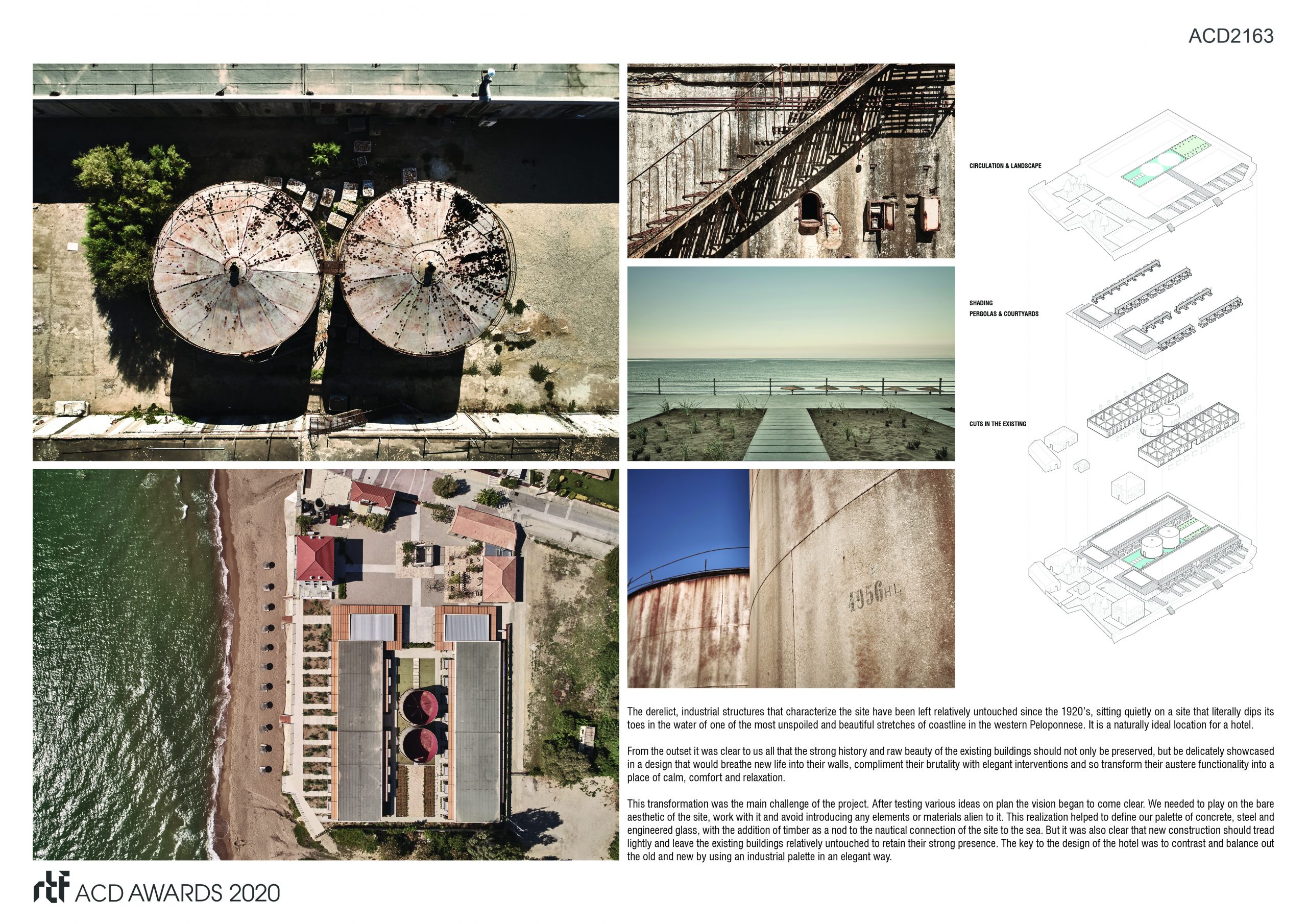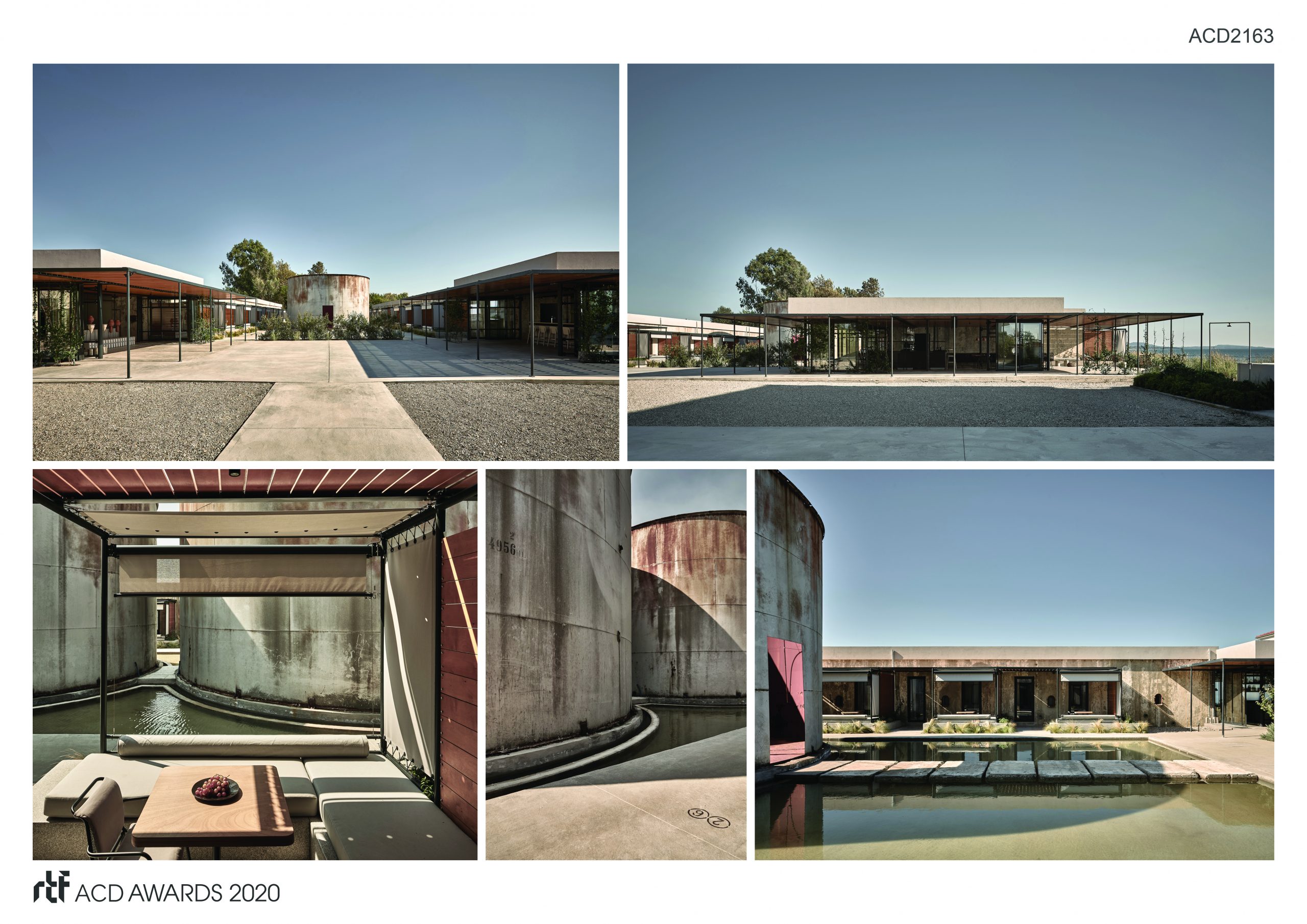 The history of Dexamenes dates back to the early 1900s, when the concrete tanks were built directly on the coastline, to store wine for export overseas. In converting the site into a hotel, the intention was to showcase the strong history and raw beauty of the existing buildings and compliment their brutality with elegant interventions. A complimentary palette of concrete, steel, timber and engineered glass ensures that new construction elements tread lightly, leaving the existing buildings relatively untouched and retaining their strong presence.