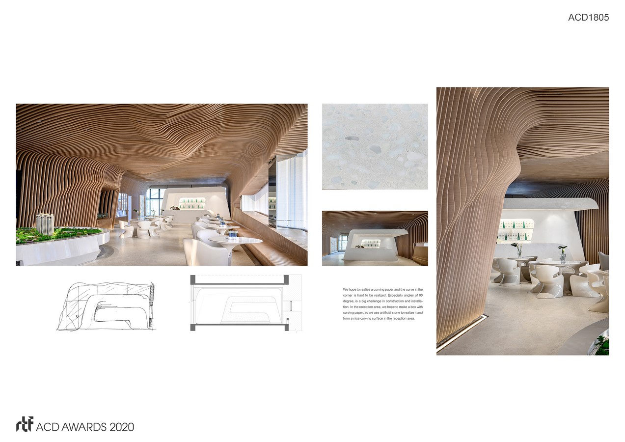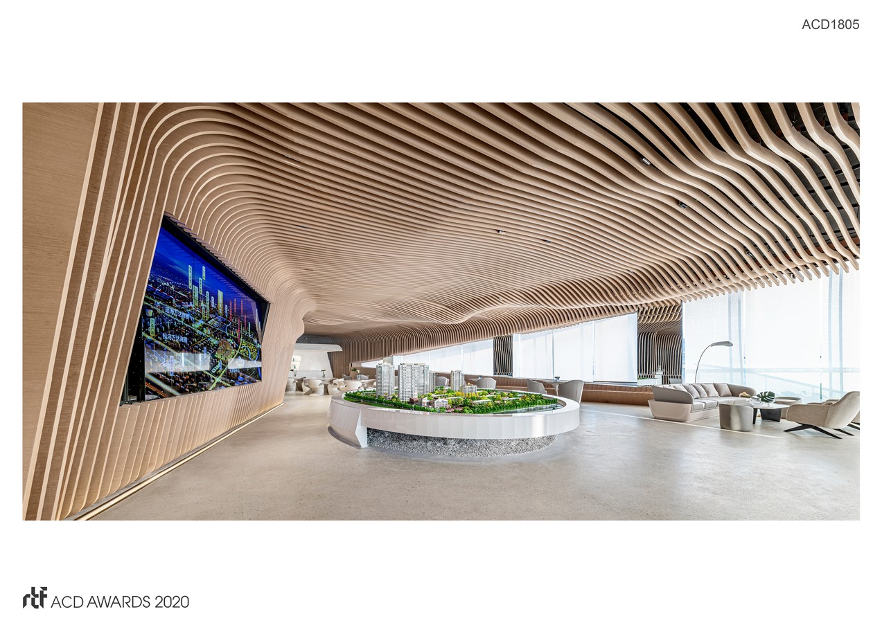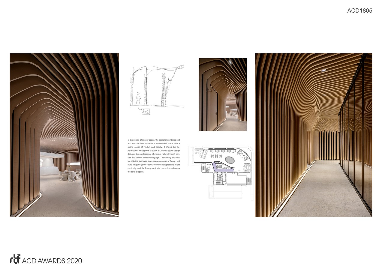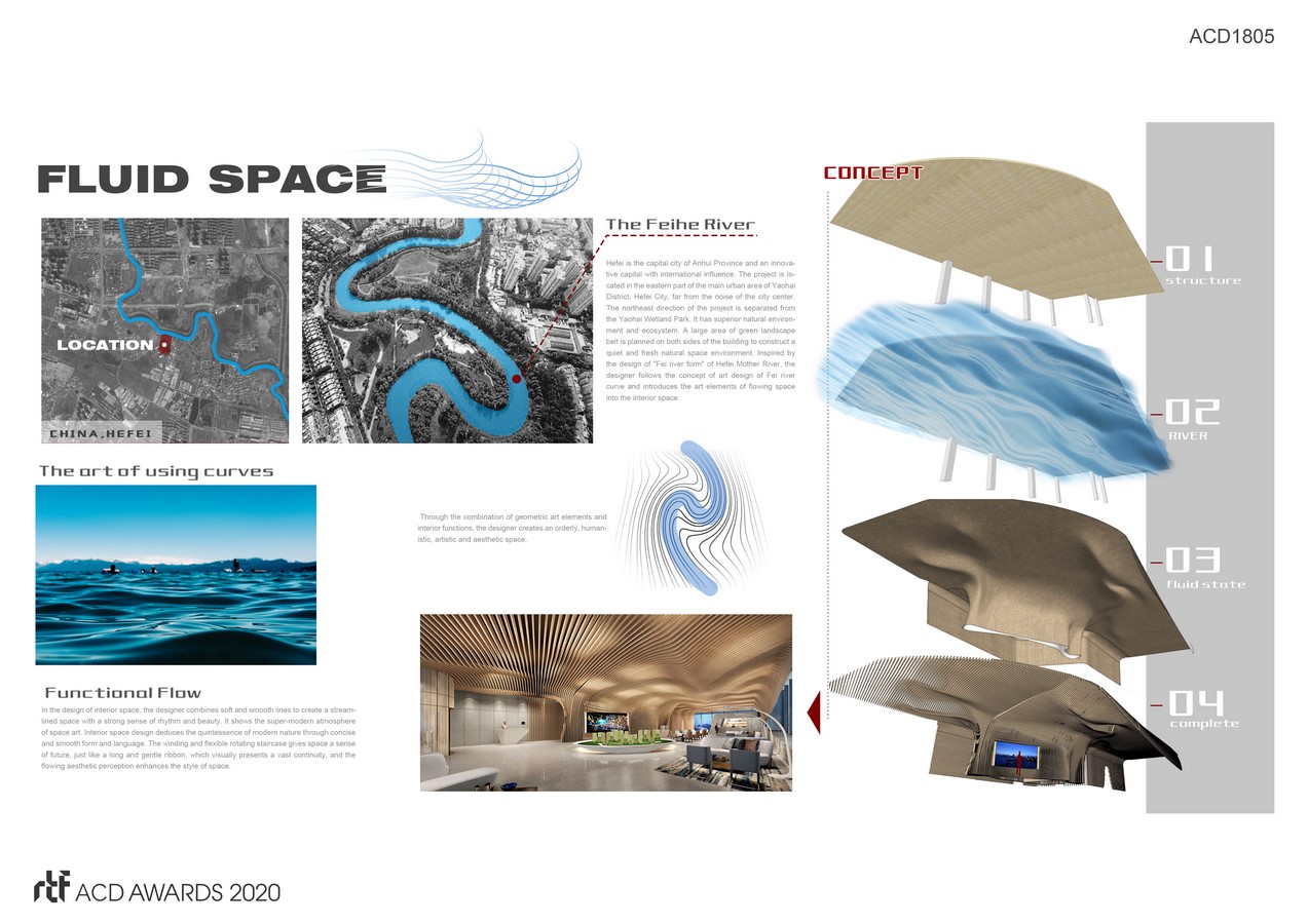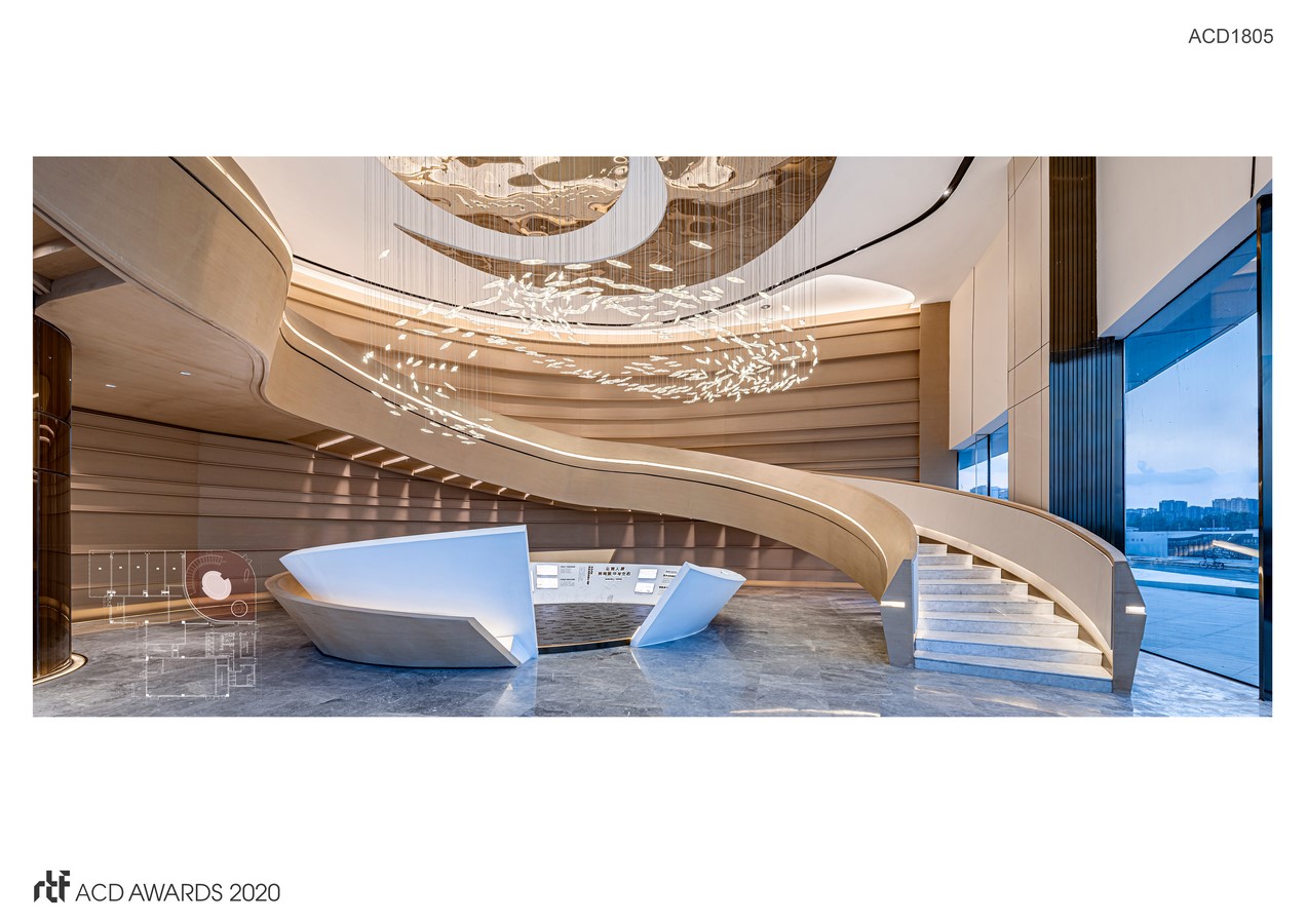 A large area of green landscape belt is planned on both sides of the building to construct a quiet and fresh natural space environment. Inspired by the design of “Fei river form” of Hefei Mother River, the designer follows the concept of art design of Fei river curve and introduces the art elements of flowing space into the interior space. Through the combination of geometric art elements and interior functions, the designer creates an orderly, humanistic, artistic and aesthetic space.