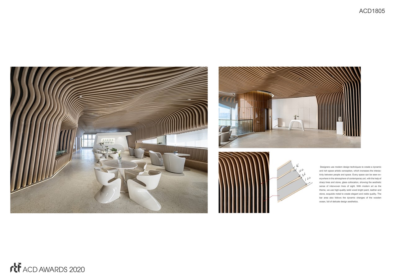 The designer applies the feeling of waves and fluctuations in the water to the indoor space. The neat wooden waves at the top of the negotiation area are interwoven with the rhythmic visual aesthetic feeling in the clouds and running water. The vitality and appeal of the curve are embodied here. It is flexible, soft and changeable, making people feel relaxed, happy and elegant. Designers use modern design techniques to create a dynamic and rich space artistic conception, which increases the interactivity between people and space. Every space can be seen everywhere in the atmosphere of contemporary art, with the help of sharp lines and stone, glass collocation, showing the aesthetic sense of interwoven lines of sight. With modern art as the theme, we use high-quality solid wood bright paint, leather and stone, exquisite metal to create elegant and noble quality. The bar area also follows the dynamic changes of the wooden ocean, full of delicate design aesthetics.