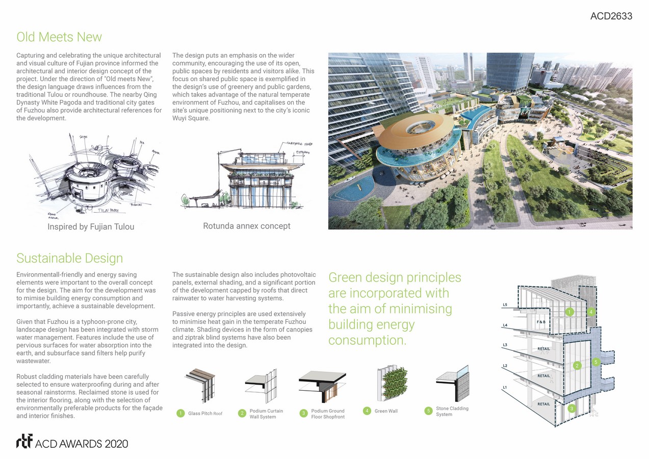 Sustainability is an integral part of Fuzhou Shangri-La Mixed-use Development. Focusing on shared public space is exemplified in the designโs use of greenery and public gardens, taking advantage of the natural temperate environment of Fuzhou, and capitalises on the sitesโ unique positioning next to the cityโs iconic Wuyi square. Landscape design is integrated into storm water management; Environmentally-preferable products are selected for exterior and interior finishes, while robust cladding materials have been carefully selected to ensure waterproofing during and after seasonal rainstorms.