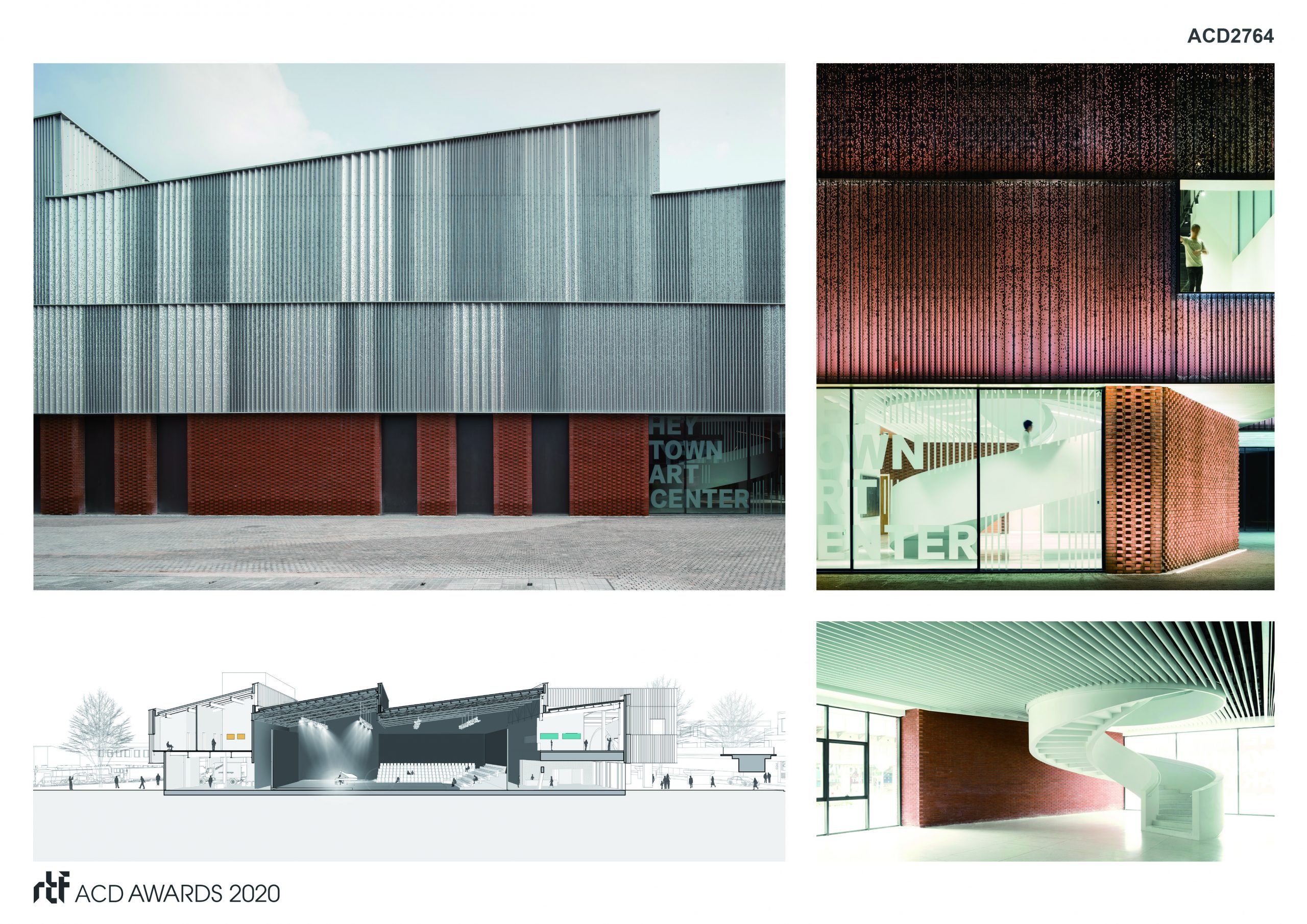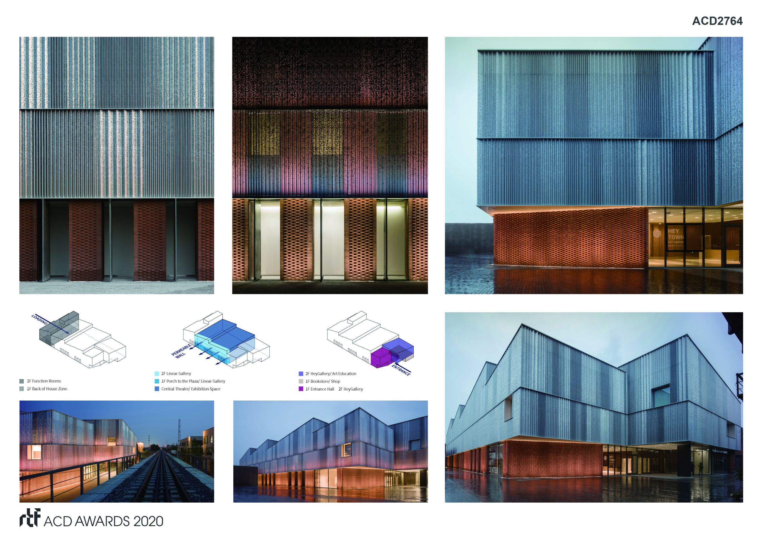 The building, with 3,300sqm, consists in three basic segments to satisfy different scenarios of indoor-outdoor program – entrance hall with HeyGallery on the second floor, connected through a large spiral stair; central space that switches between a theater with 500 seats or open up as exhibition space with direct skylight and a series of large pivot doors opening to the plaza; back of house zone with function rooms. In addition, there are also a bookstore/shop, a double-floor linear gallery, an art education studio, among many other support spaces.