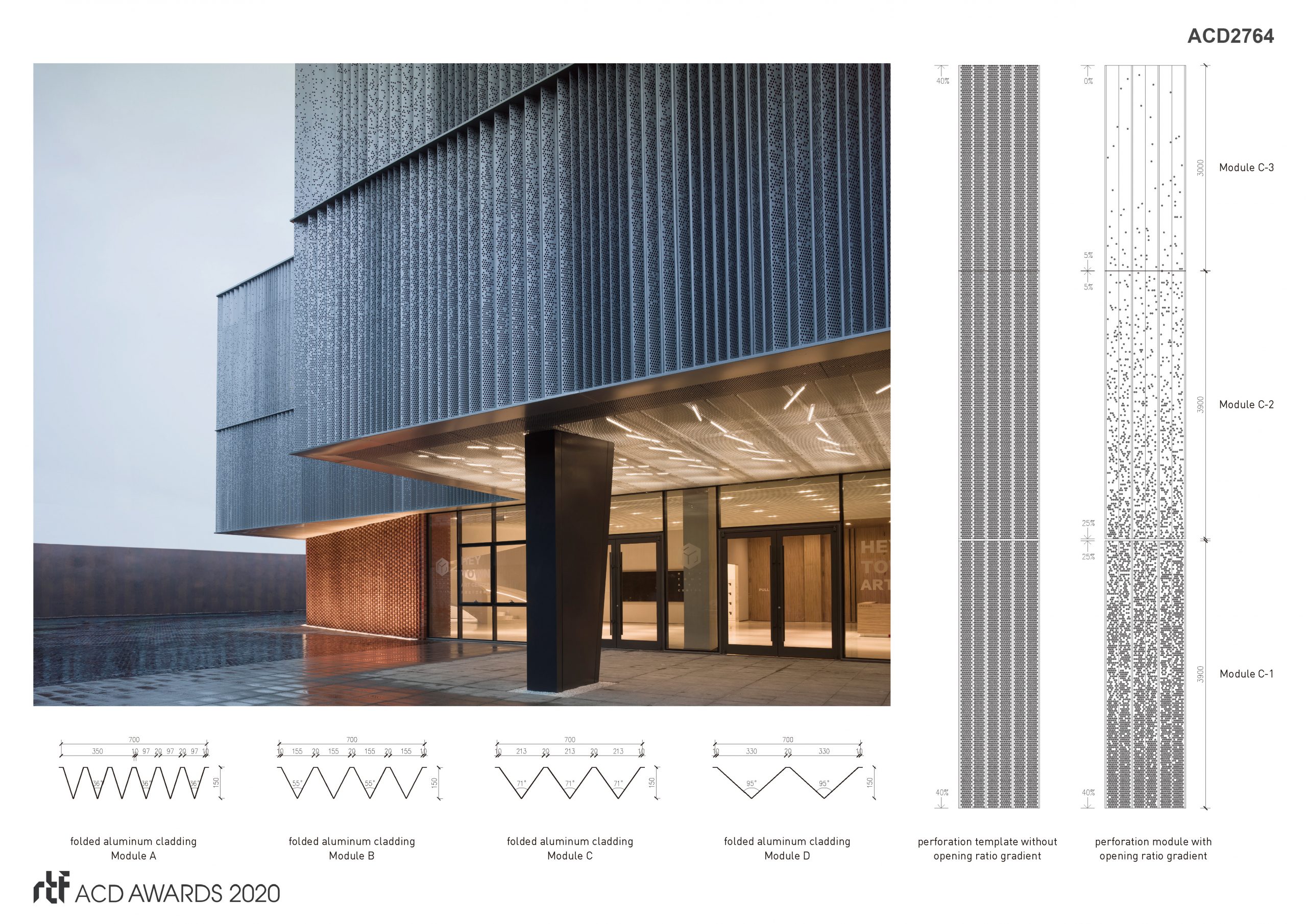 The project features an aluminum façade wrapping around the entire suspending saw-tooth volume. Instead of perusing a smooth and sleek image of a definite “newness”, it was taken as an experiment on potential “natures” of the material: minimum angle of folding, jumping rhythm of corrugations, changing ratio of perforation…all together to achieve a visual effect that is in constant “dialogue” with the surroundings.