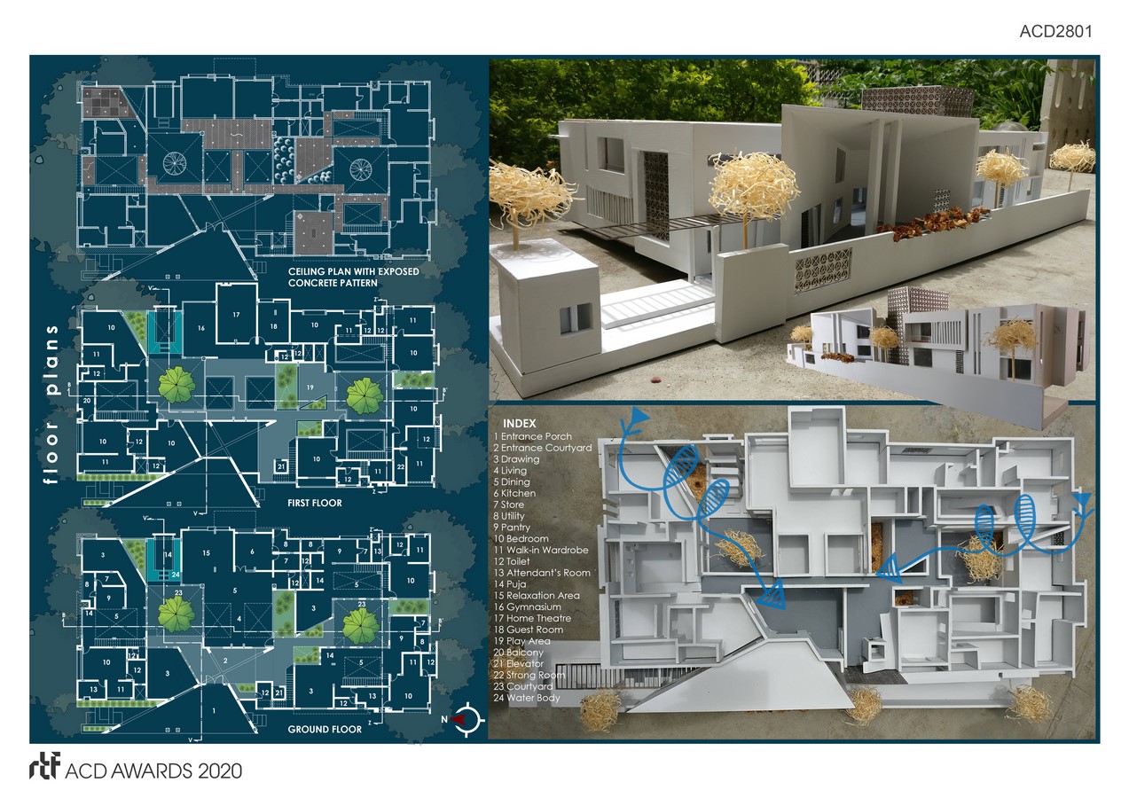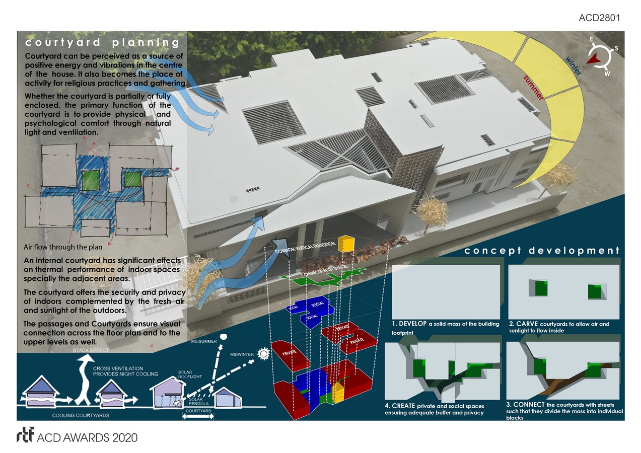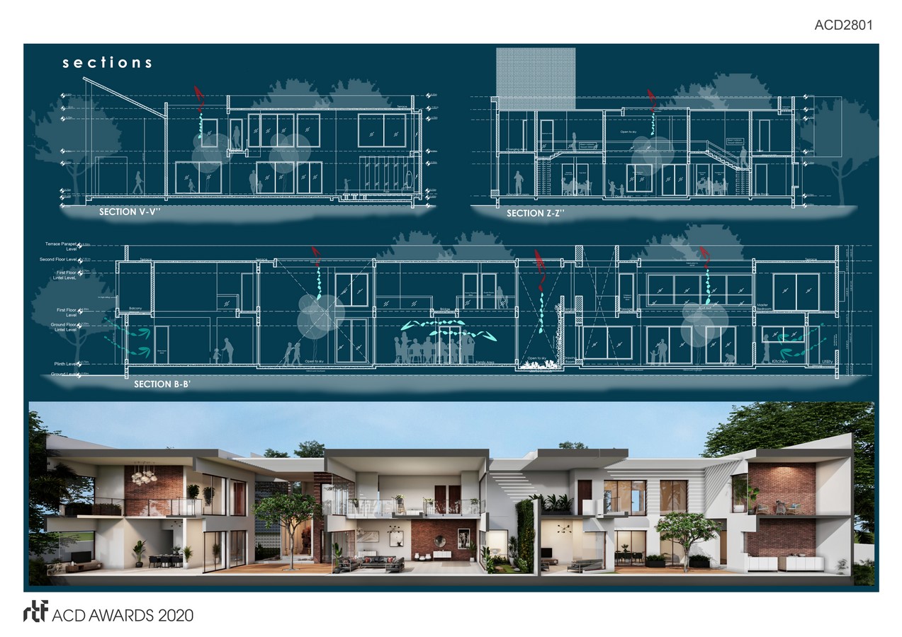 All the private blocks are separated by a buffer of open landscape areas. North-South axial bridge connects all the private and social blocks on first floor. Visual connection with upper floors can be witnessed through double height spaces and courtyards. The open to sky streets, landscape areas, jali walls and courtyards allow incoming of abundant light and wind flow throughout the open and semi open spaces. The vegetation and water body inside create a micro-climate which helps in maintaining ambient temperature inside.