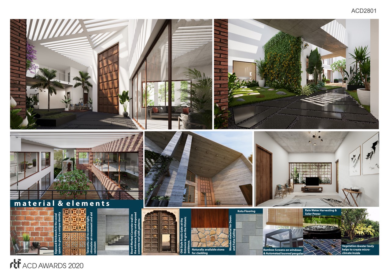 The use of local materials like exposed brickwork, Kota flooring, exposed concrete ceiling, terracotta screens, water body, courtyards, open streets and landscape area are conducive to a unique and traditional ambience of the space and creating its own identity. Energy efficient systems, sustainable processess like rain water harvesting, waste management systems set an example and make the project future ready.