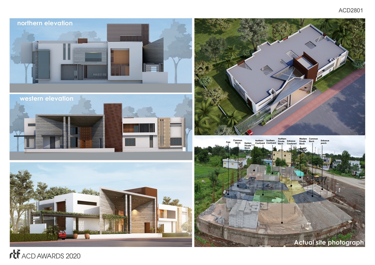 Similarly, the West facing plot has been designed with a sixty feet wide double height entrance porch with inclined roof to give the grandeur that enters into double height entrance courtyard. The eighteen feet high solid wood door with mini door for everyday use hints at the large Indian courtyard houses of the past. This courtyard is further connected by narrow streets leading to the northern and southern courtyard. The northern courtyard is flanked by common/social block towards south and one private block towards north. The puja on the east binds these two blocks to complete the northern courtyard. Two private blocks towards east and west complete the setting of the southern courtyard.