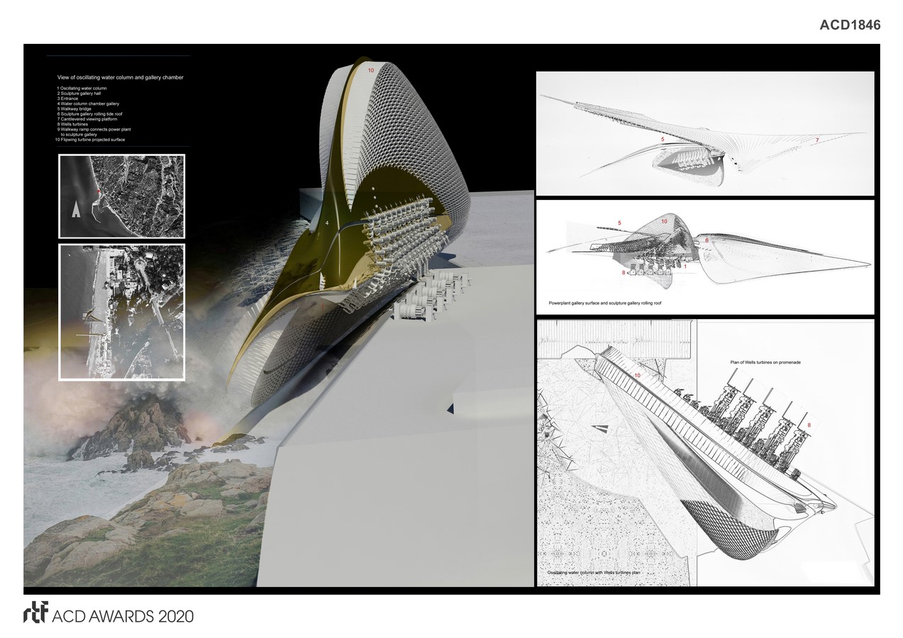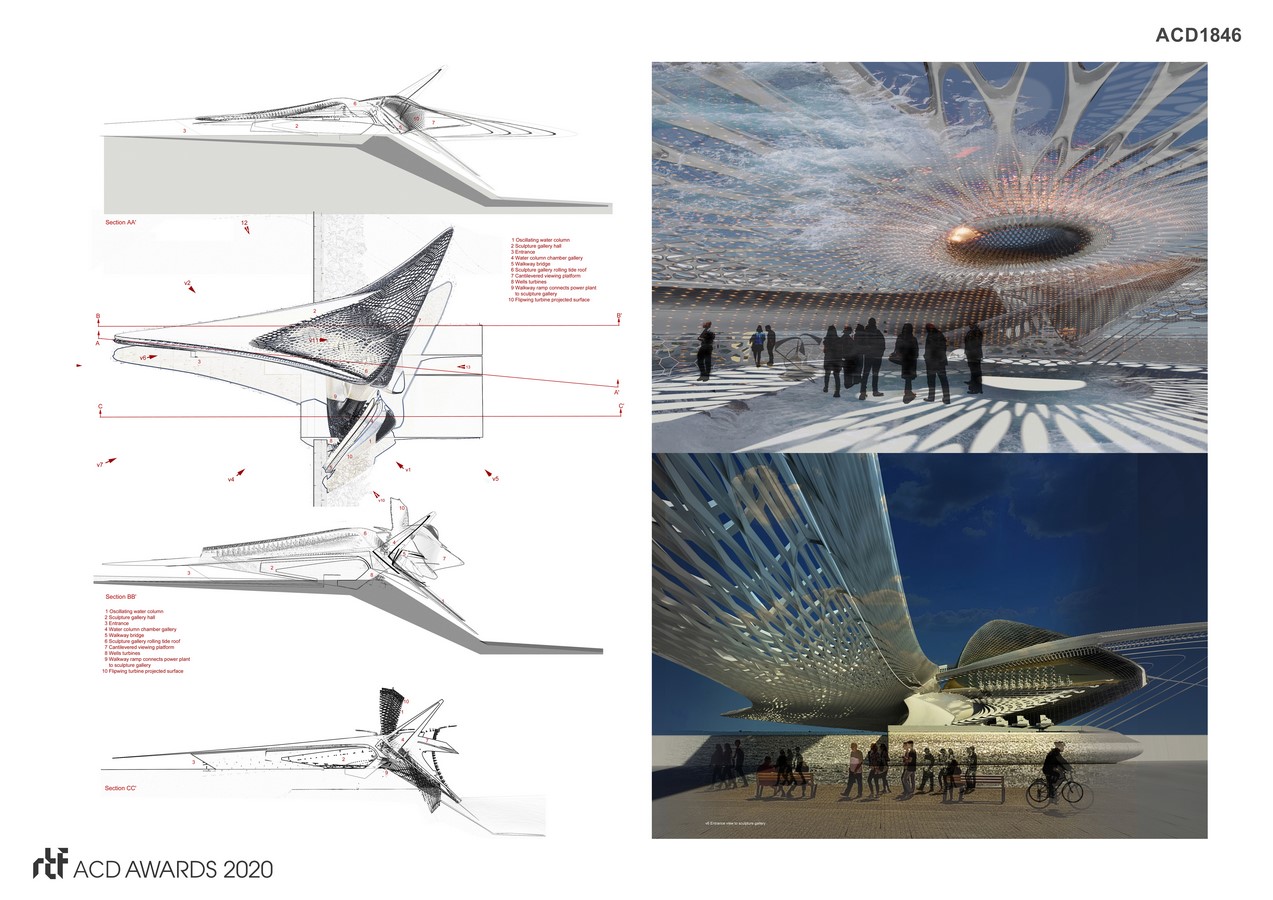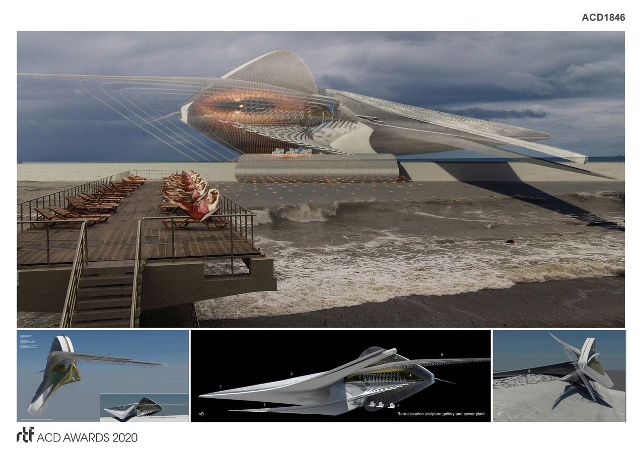 The design uses renewable energy to redefine typologies in architecture and the built environment. The site is located in Sochi, a coastal city on the Black Sea in Russia, the building employs the oscillating water column principle to harness wave energy converting this mechanical energy to generate electricity, the building also accommodates a sculpture gallery. This symbiotic program merges a small power plant capable of producing up to 300kW with a sculpture gallery in the attempt to redefine typologies to accommodate for self-sufficiency by generating sustainable energy that is fed back into the grid, this project aims to run 200 households and businesses within its vicinity.