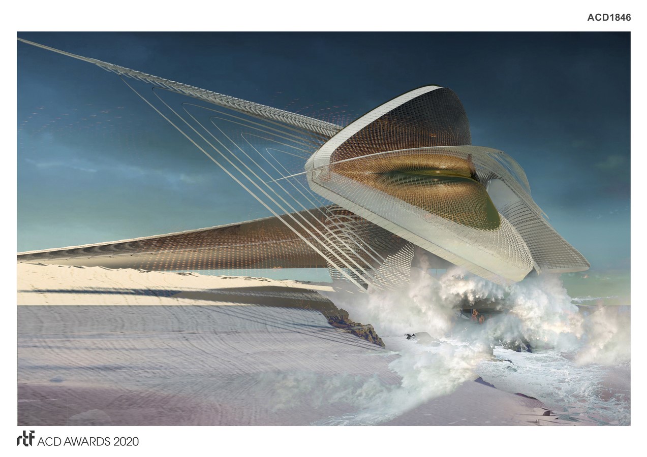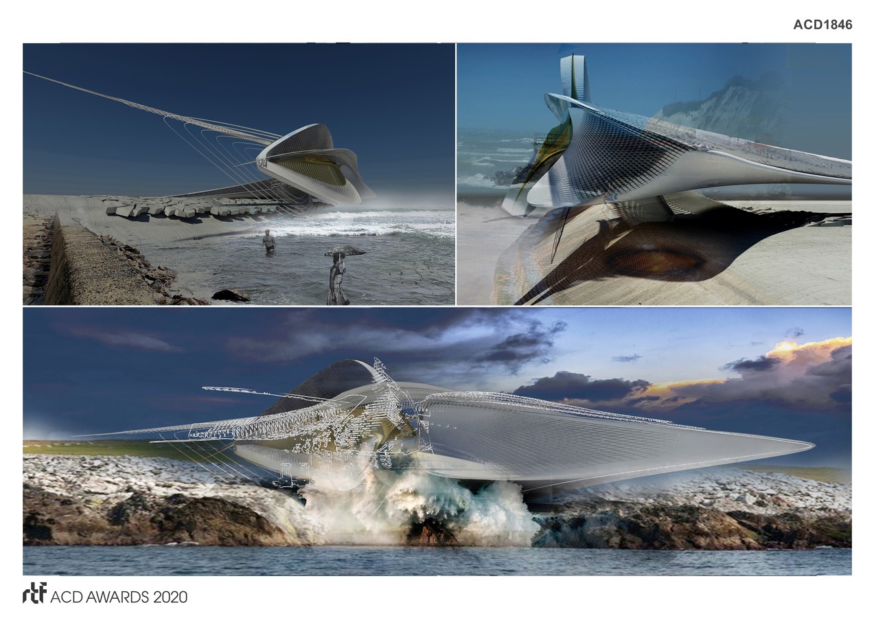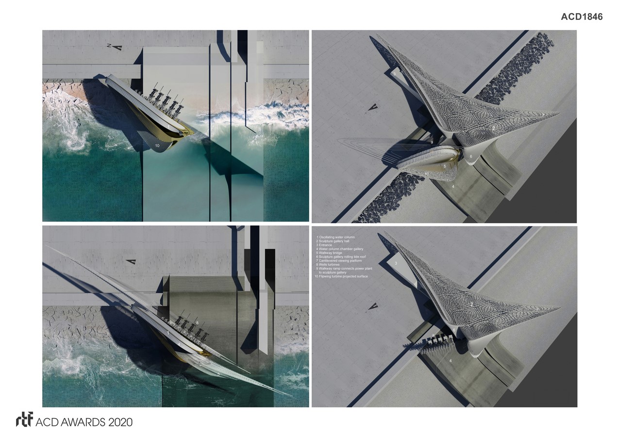 The design uses renewable energy to redefine typologies in architecture and the built environment. The site is located in Sochi, a coastal city on the Black Sea in Russia, the building employs the oscillating water column principle to harness wave energy converting this mechanical energy to generate electricity, the building also accommodates a sculpture gallery. This symbiotic program merges a small power plant capable of producing up to 300kW with a sculpture gallery in the attempt to redefine typologies to accommodate for self-sufficiency by generating sustainable energy that is fed back into the grid, this project aims to run 200 households and businesses within its vicinity.