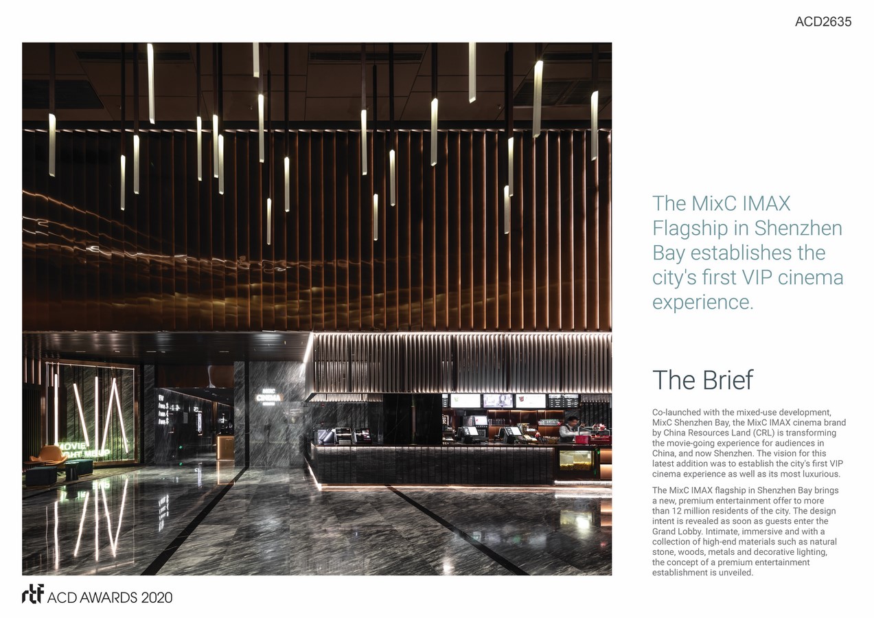 Covering over 3,400sqm, the design took inspiration from the luxury hotel industry, bringing a distinctive, premium and immersive experience with a user-centric approach; a design befitting the cinema’s status as the anchor leisure and entertainment offer for the wider 80,000sqm MixC Shenzhen Bay retail development.