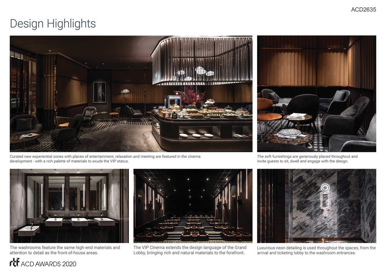Cinema-goers are met with a rich and contemporary design throughout the space with double-height ceilings and illuminated, textured walls embellished with natural woods, metals and stone. Soft furnishings invite guests to sit and dwell within the space, allowing guests to engage with the design. Neon lighting designs add an elegant yet playful visual. Considering the holistic experience, amenities such as the washrooms feature the same high-end materials and attention to detail as the front-of-house areas.