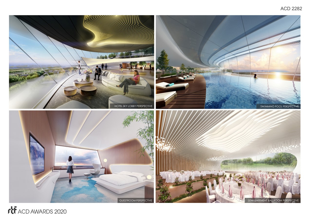 Other facilities like a tea room, yoga and meditation studios assure guests feel rejuvenated and refreshed during the stay. The hotel is further developed through organically shaped plans, creating a multi-layer ‘cloud-like’ form. Ceramic-fritted glass panels line the slabs, blurring the edges, giving the building an illusion of materializing out of a dream-like mist.