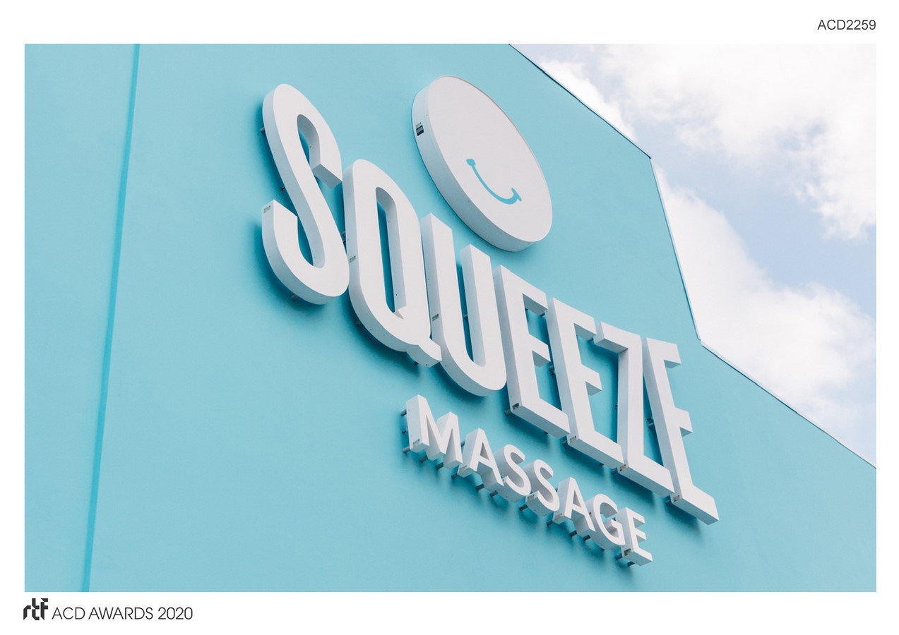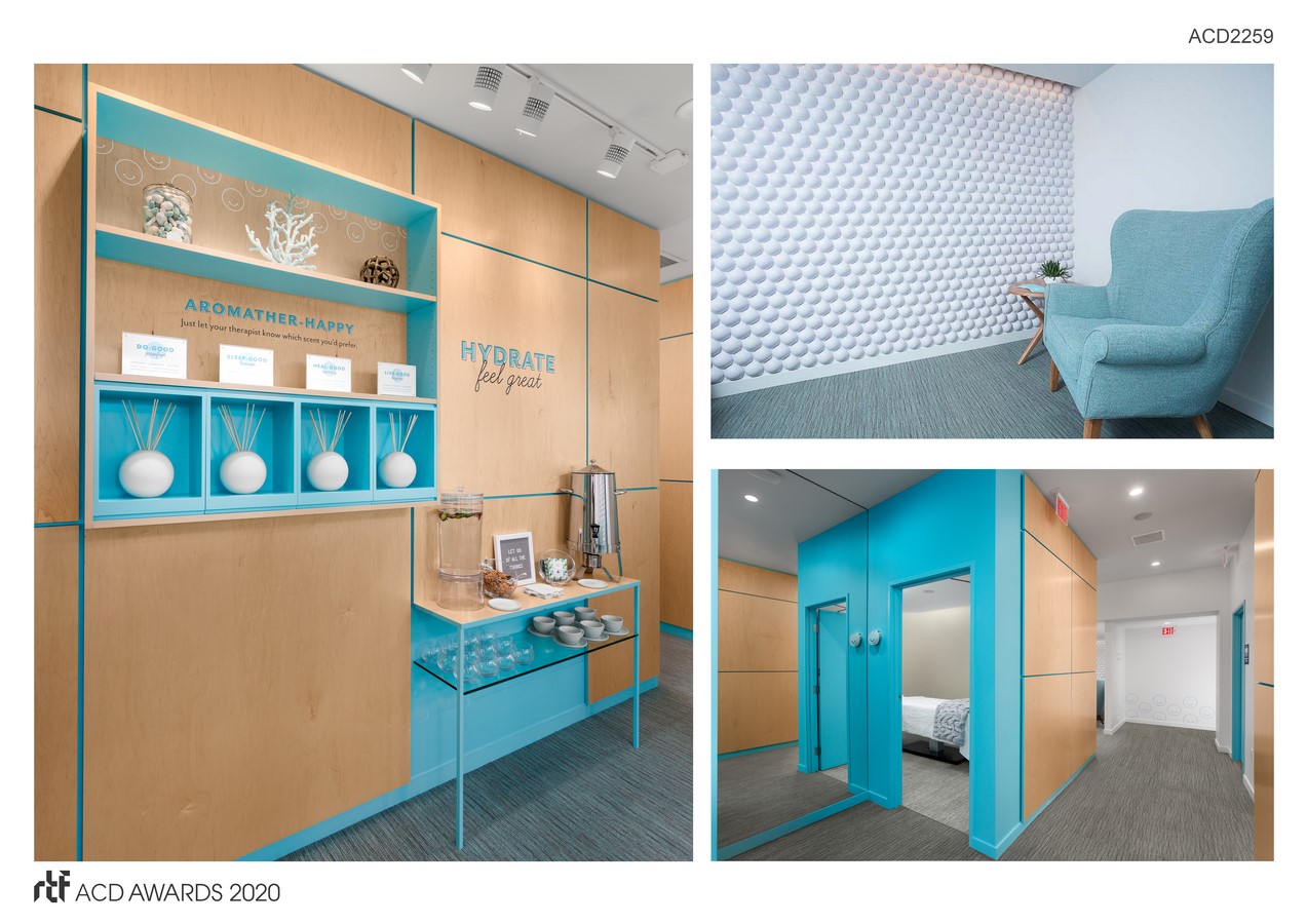 The experiential journey of Squeeze is imagined as a gradual transition from the hustle and bustle of the outside world to the privacy and serenity of the individualized treatment rooms. After being greeted at reception, customers move to a protected, interior relaxation lounge where they can enjoy tea or water and sample aromatherapy options. Once inside the treatment room, guests will find their own dedicated space to comfortably change, conveniently store their belongings, and easily customize their environment with touch screen control of light, temperature and music. The guest station is stocked with everything needed to help support the experience within easy reach – including mints, cough drops, hair ties and phone charging – as well as a large personal mirror for checking in before emerging back into outside world.