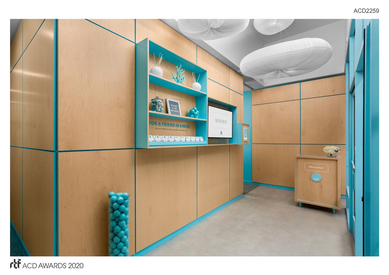 Squeeze is exactly the kind of project we love – partnering with a client who is intentionally trying to disrupt an industry and create something entirely new and ownable. Like drybar, which sought to break the ubiquitous hair salon mold of a long line of chairs facing mirrors, the design of Squeeze has moved away from the impersonal collection of endless doors and hallways to a series of individualized treatment cubes. Like jewelry boxes, the treatments suites have protective wood paneled rectilinear exterior walls that help insulate the softer and quieter finishes of the rounded interior spaces. In the relaxation lounge, common rubber stress balls have been used to create a signature feature wall that resembles and winks at the iconic tufted fabric walls of drybar.