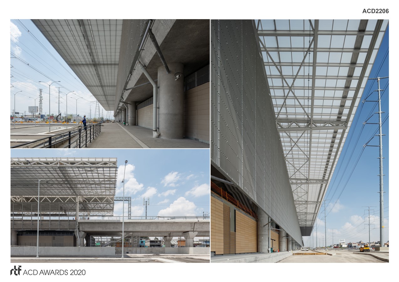 The station finishes were designed thinking of having a language similar to the high voltage towers located in Avenida las Torres. Also the color palet of these elements was taken as a criterion so that the materials were not so different in the seasons. (gray and metal).