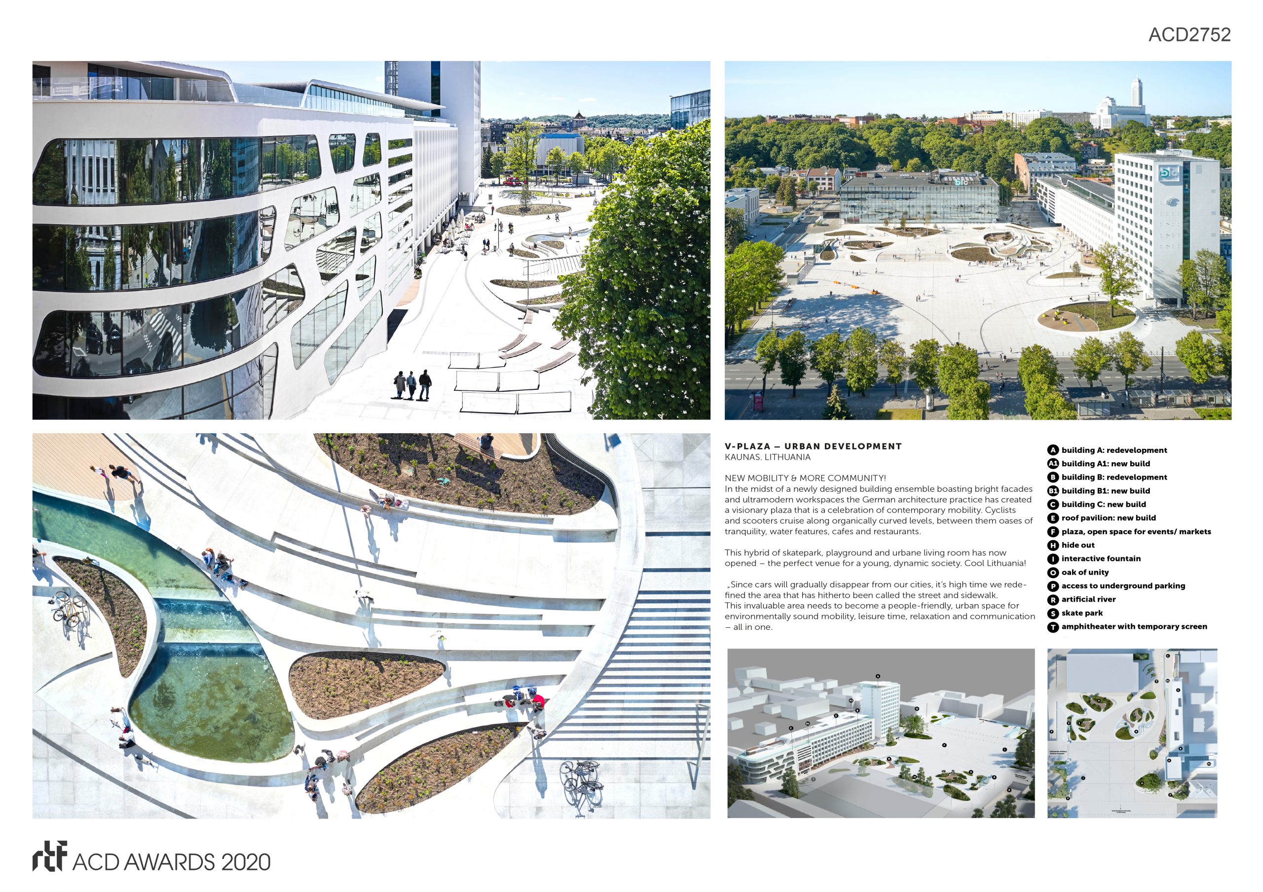 Amidst a newly designed building ensemble with bright façades & ultra-modern workspaces, a visionary plaza was created that celebrates contemporary mobility. Organically curved levels, in between oases of tranquility, water features, cafés & restaurants.