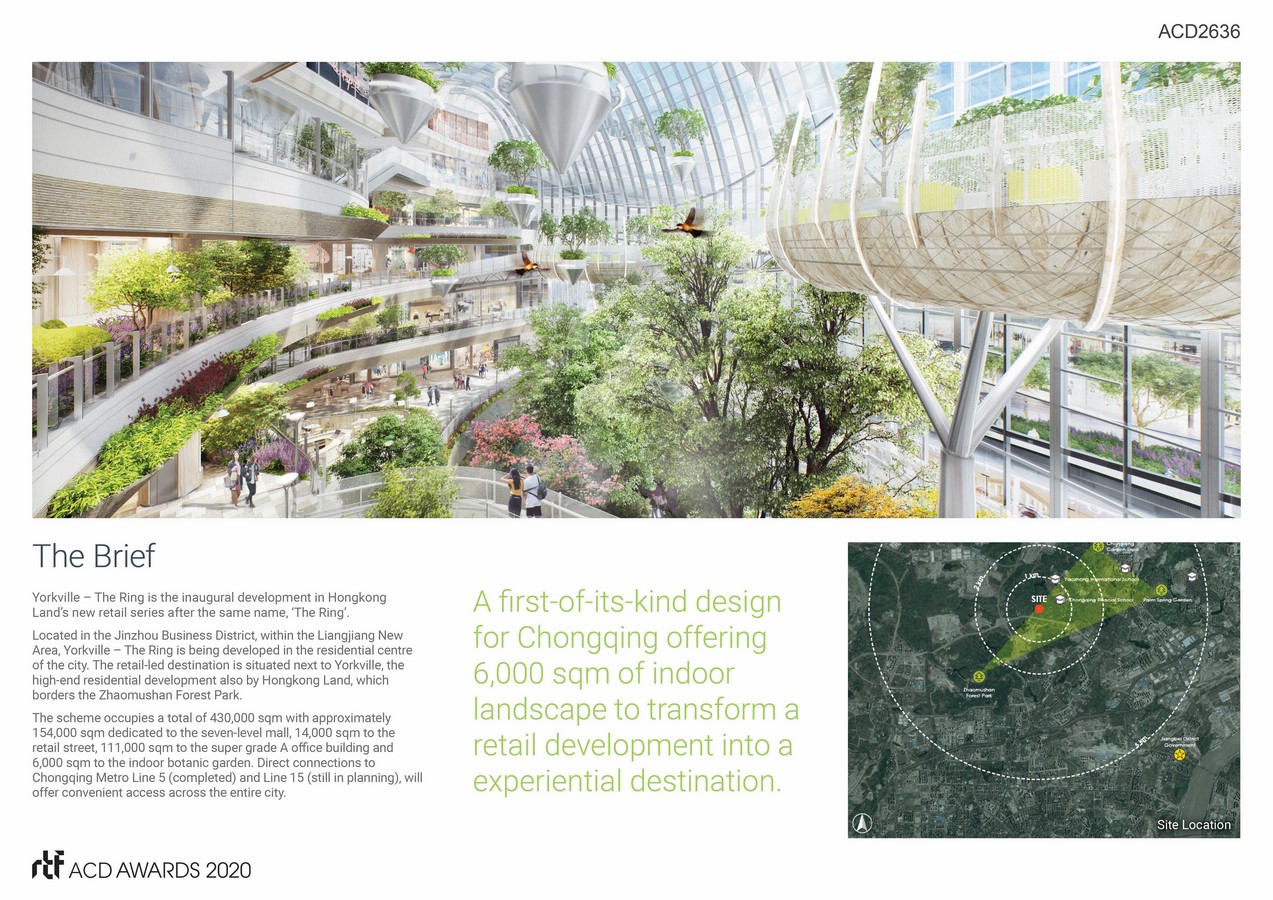 Located in the Jinzhou Business District, within the Liangjiang New Area, Yorkville – The Ring is being developed in the residential centre of the city. The retail-led destination is situated next to Yorkville, the high-end residential development also by Hongkong Land, which borders the Zhaomushan Forest Park.