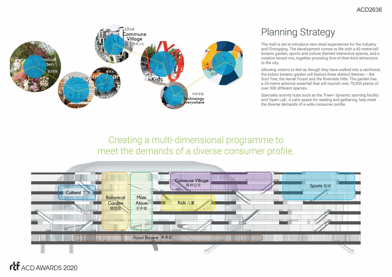 The scheme occupies a total of 430,000 sqm with approximately 154,000 sqm dedicated to the seven-level mall, 14,000 sqm to the retail street, 111,000 sqm to the super grade A office building and 6,000 sqm to the indoor botanic garden. Direct connections to Chongqing Metro Line 5 (completed) and Line 15 (still in planning), will offer convenient access across the entire city.