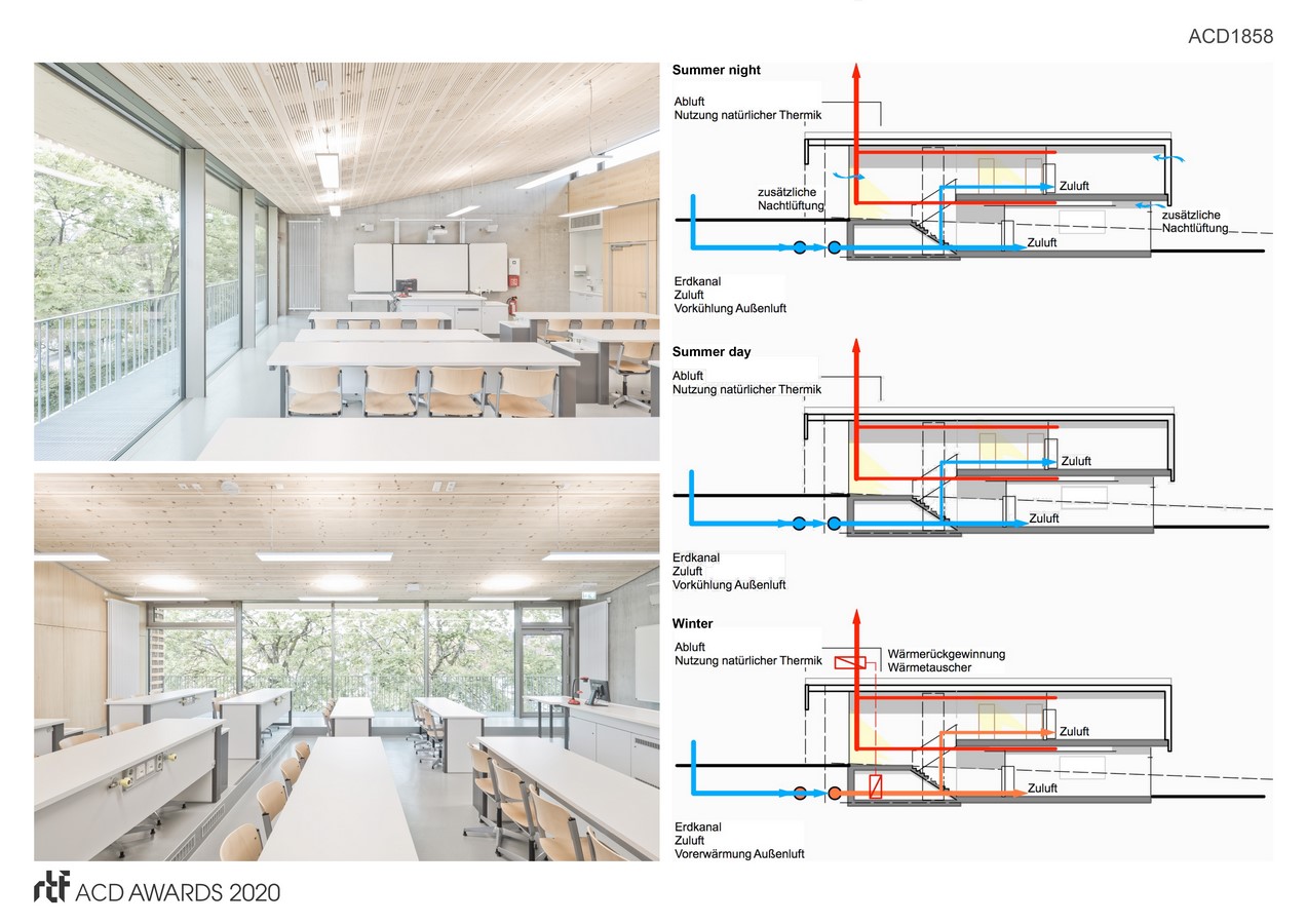 The fresh air used to ventilate the building is supplied via a 45m-long underground conduit that exploits the natural difference between ground and external air temperatures, cooling the air supply naturally in summer, preheating it in winter. Even at low outside temperatures, this system can guarantee air quality economically and efficiently without draughts and so ensure constant CO2 levels in the classroom. This is important because windows cannot be opened during lessons due to street noise and brief bouts of natural ventilation during breaks alone would be insufficient to achieve the necessary air exchange. The result would be an increase in CO2 levels and the associated tiredness, performance loss and increased risk of the spread of germs.