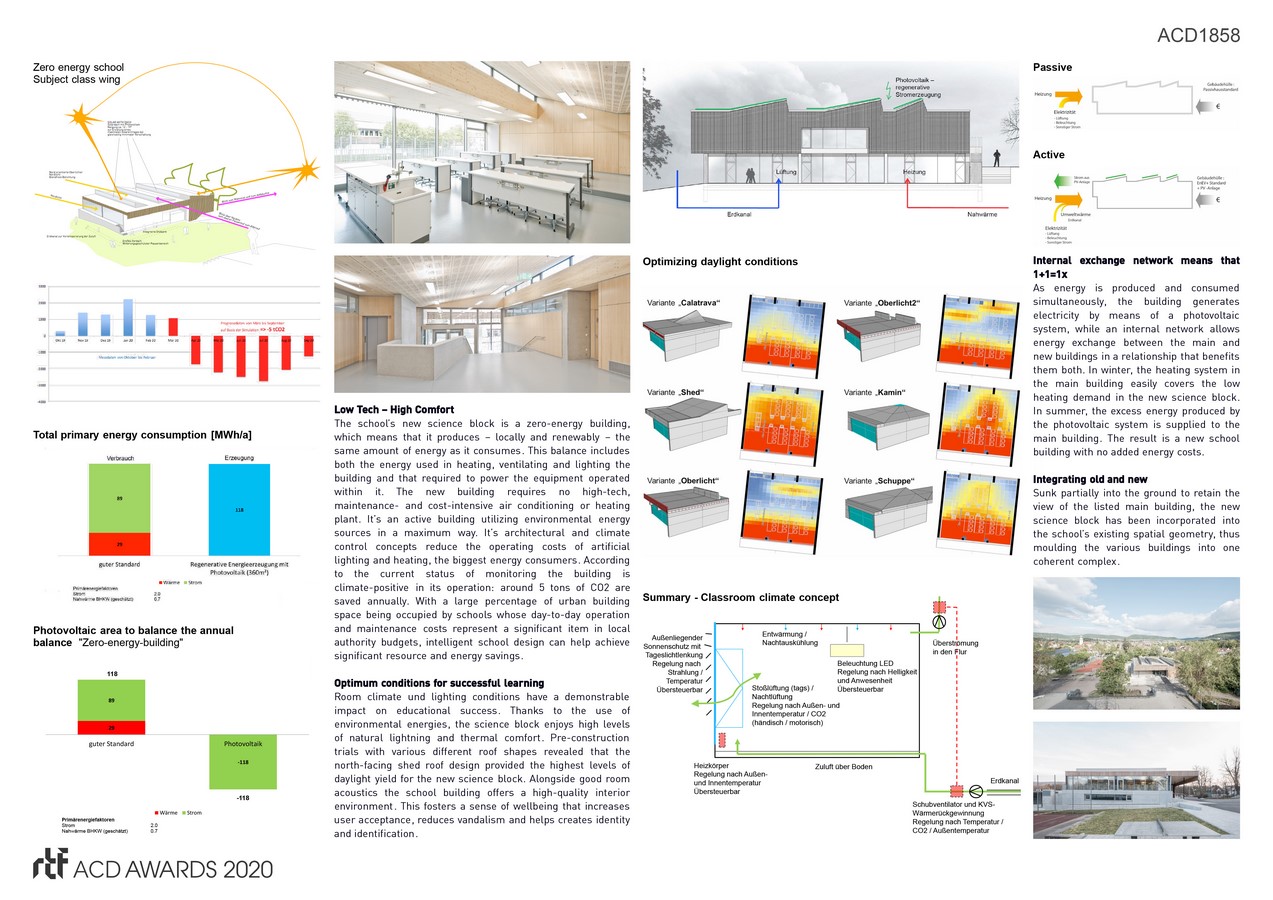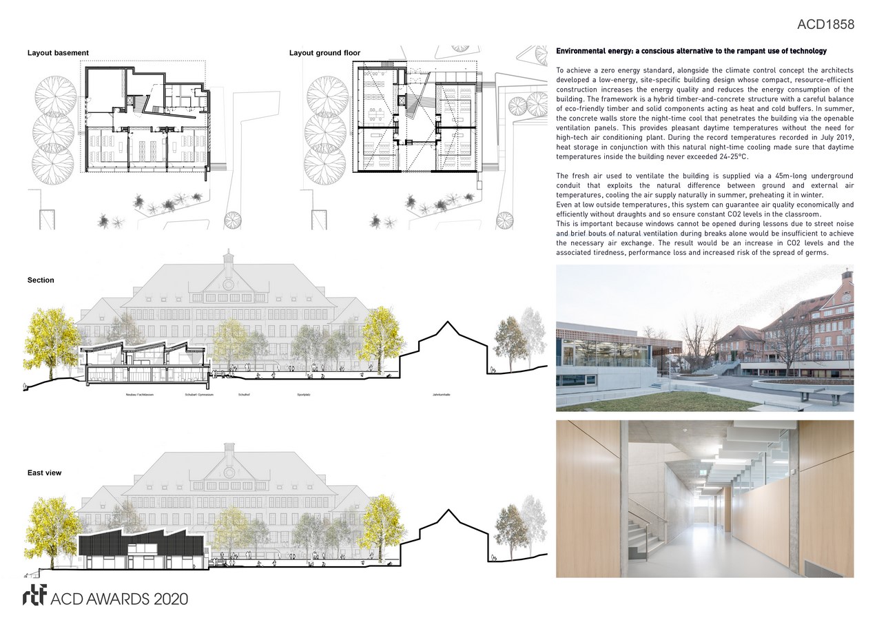 The school’s science block is a zero-energy building producing – locally and renewably – the same amount of energy as it consumes. This balance includes both the energy used in heating, ventilating and lighting and that required to power the equipment operated within it. The building requires no high-tech, maintenance- and cost-intensive air conditioning or heating plant. It’s an active building utilizing environmental energy sources in a maximum way. It’s architectural and climate control concepts reduce the operating costs of artificial lighting and heating, the biggest energy consumers. The building is also climate-positive in its operation: around 5 tons of CO2 are saved annually.