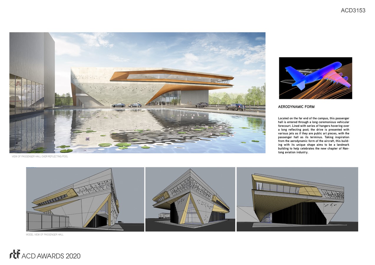 Located on the far end of the campus, this passenger hall is entered through a long ceremonious vehicular forecourt. Lined with series of hangers hovering over a long reflecting pool; the drive is presented with various jets as if they are public art pieces, with the passenger hall as its terminus. Taking inspiration from the aerodynamic form of the aircraft, this building with its unique shape aims to be a landmark building to help celebrates the new chapter of Nantong aviation industry.