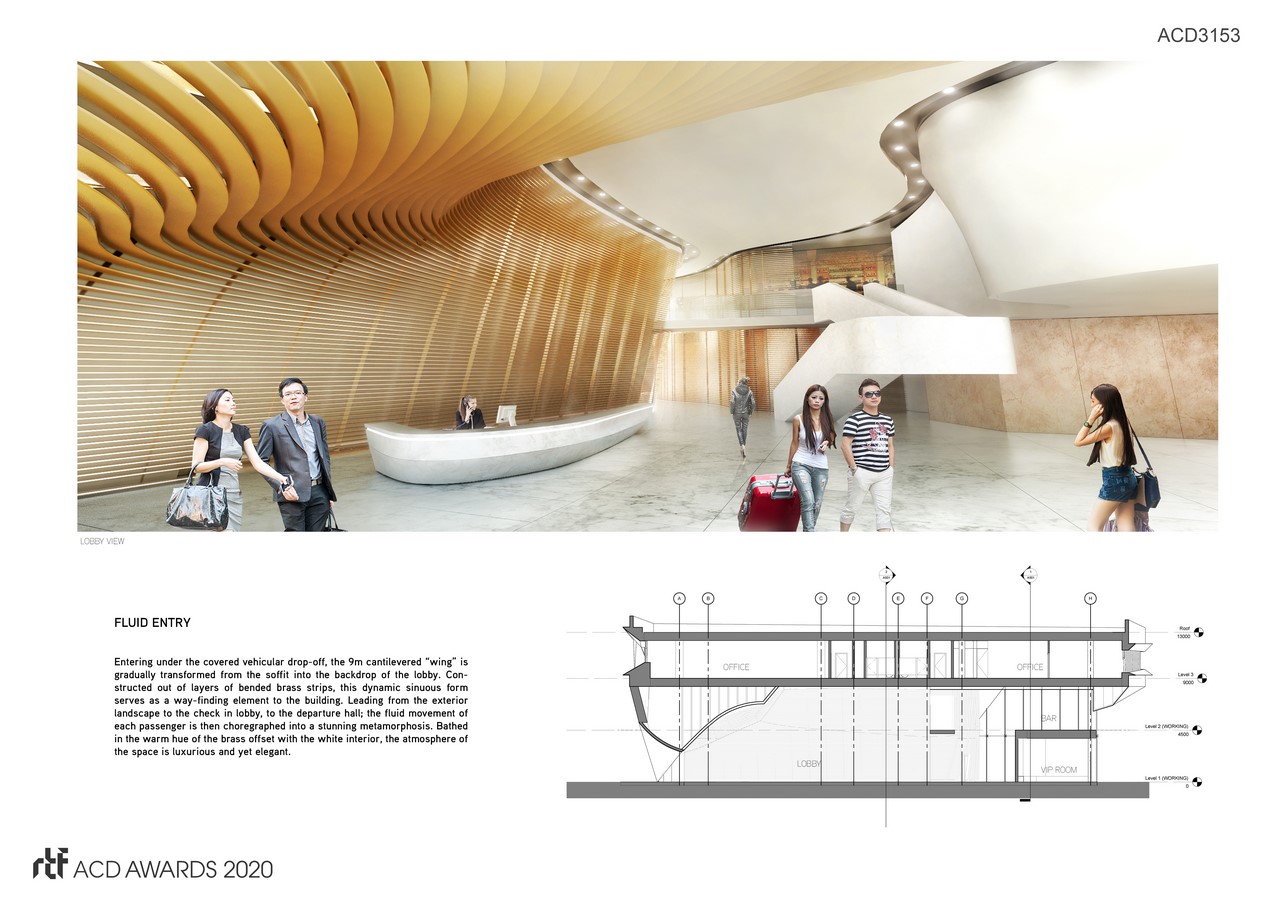 Entering under the covered vehicular drop-off, the 9m cantilevered โwingโ is gradually transformed from the soffit into the backdrop of the lobby. Constructed out of layers of bended brass strips, this dynamic sinuous form serves as a way-finding element to the building. Leading from the exterior landscape to the check in lobby, to the departure hall; the fluid movement of each passenger is then choregraphed into a stunning metamorphosis. Bathed in the warm hue of the brass offset with the white interior, the atmosphere of the space is luxurious and yet elegant.