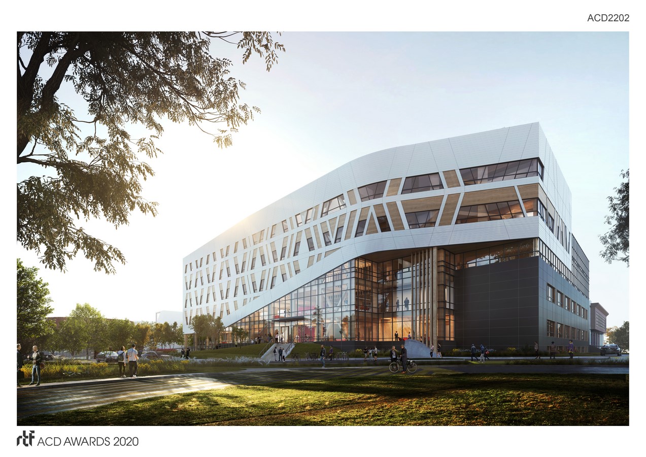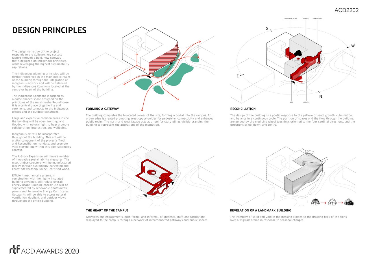 Located on Centennial College Progress Campus in Scarborough, Ontario, the A-Block Expansion Building’s design will be a new landmark with the objective of enriching the campus entrance, promoting the future of education in a diverse and inclusive environment and embodying the College’s deep commitment to Truth and Reconciliation.