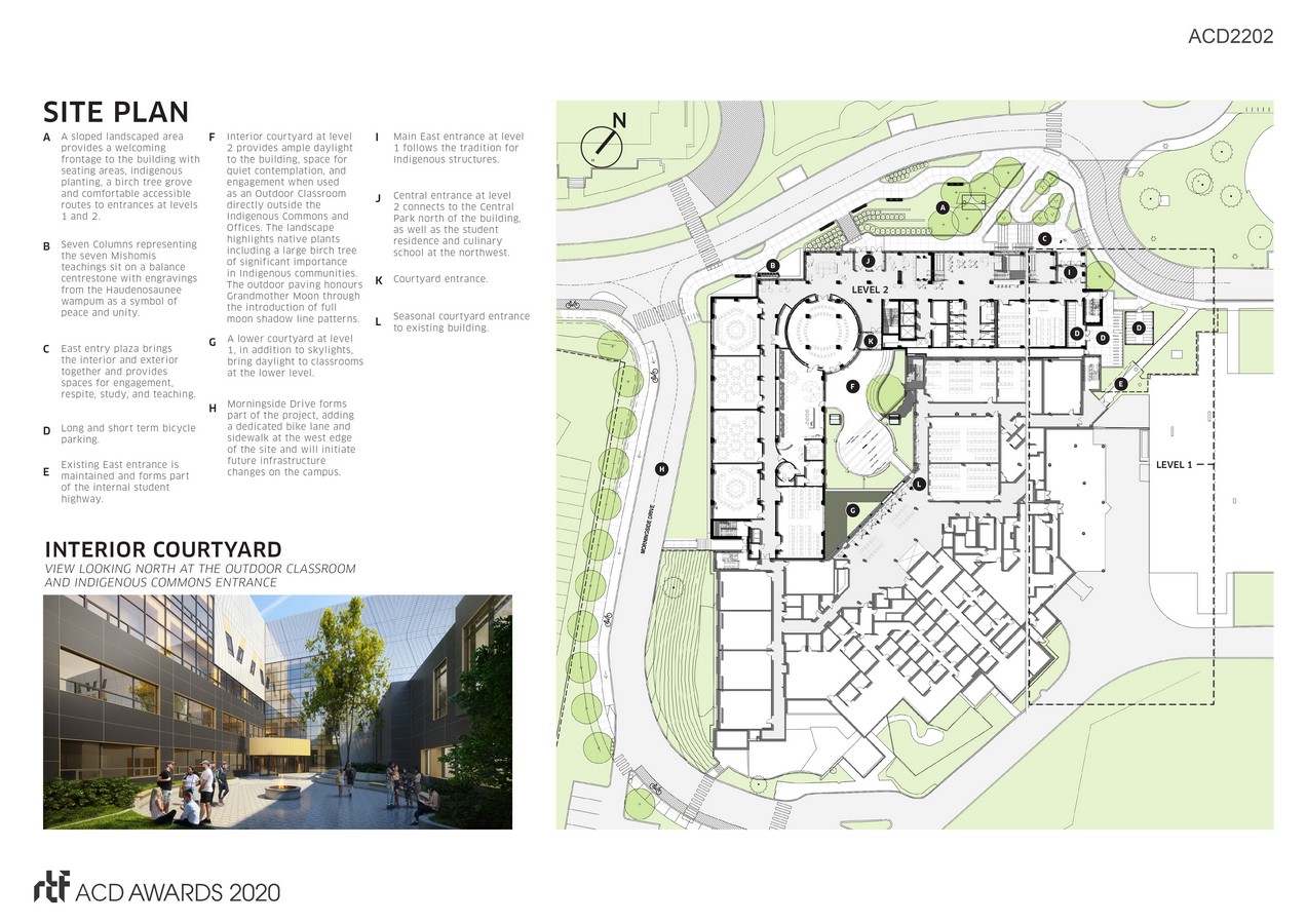 The new building connects to the existing street edge and includes a large landscaped area filled with Indigenous plantings. It also seamlessly connects to the existing A-Block Building and transforms the south-west corner of the campus, forming a gateway and yielding greater pedestrian connections that enhance the public realm.