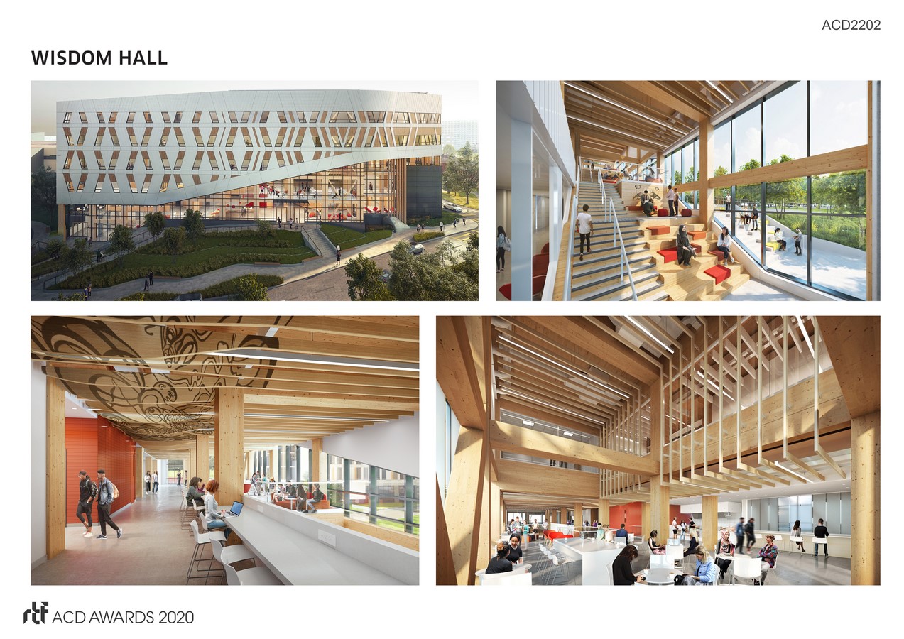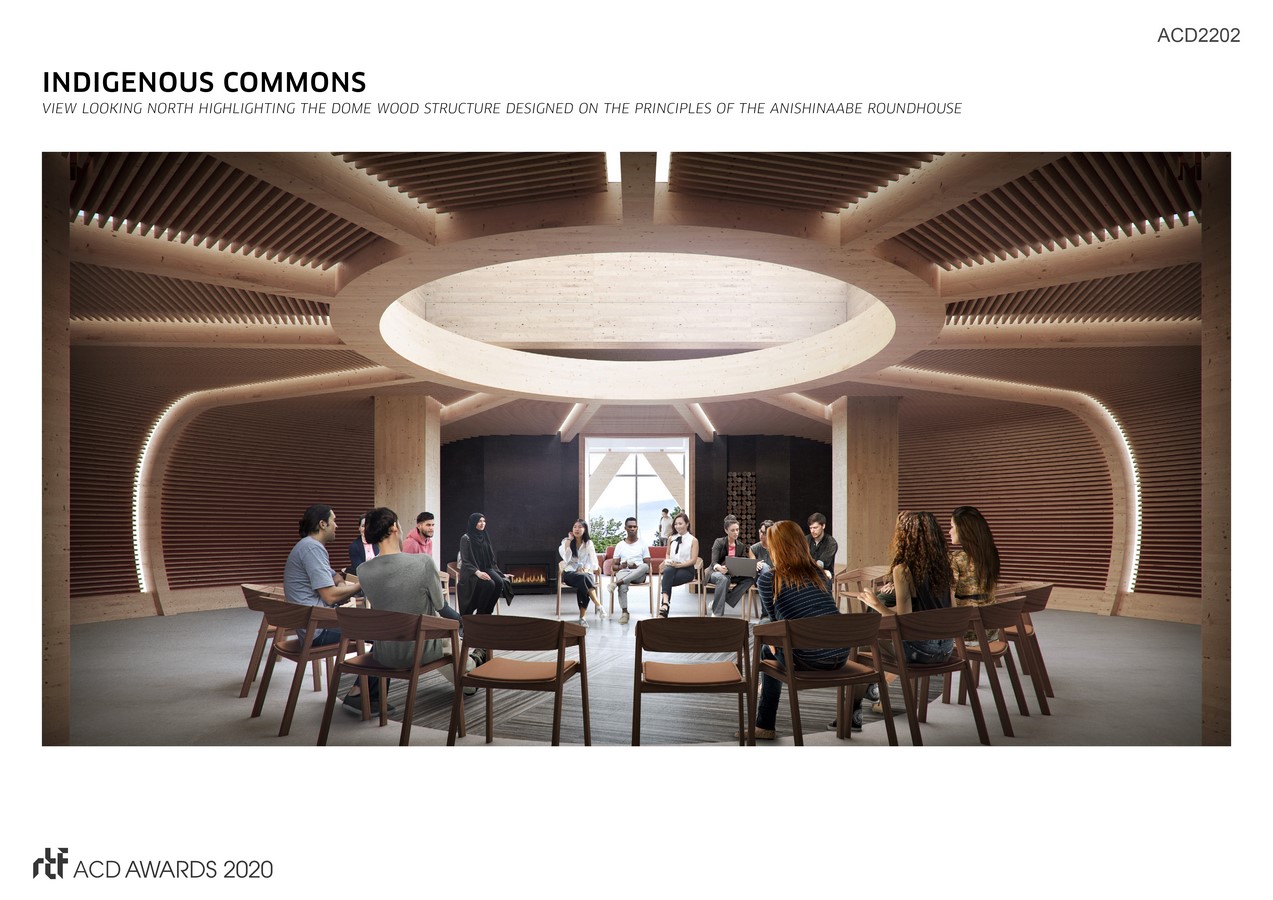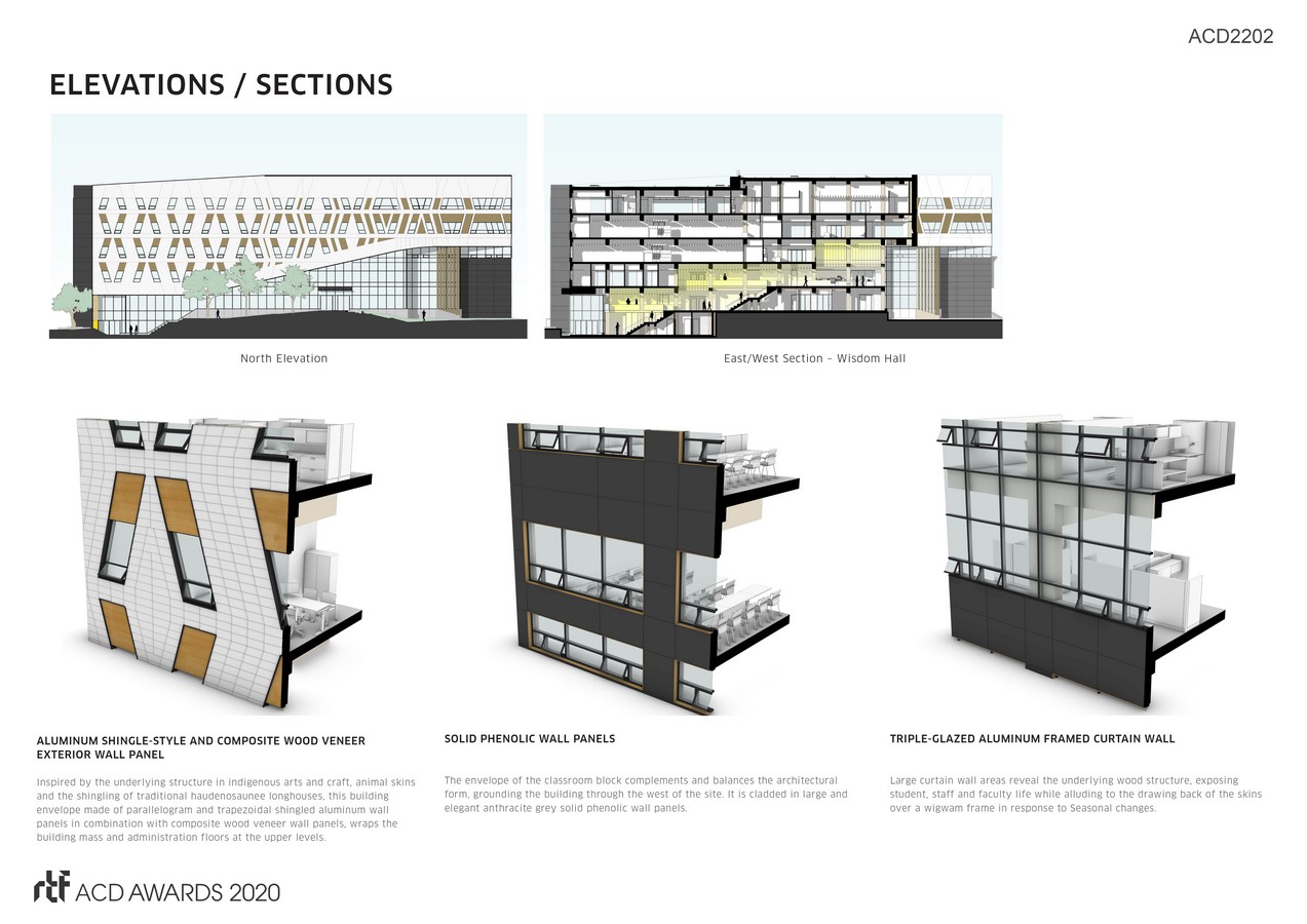The building form is inspired by Indigenous principles and the Mi’kmaq concept of two-eyed seeing (seeing through both an Indigenous lens and Western lens). The main entry is at the east, the traditional location for the entrance in Indigenous structures. A grand stair ascends from the East entrance towards the west, lined with Indigenous stories and forming part of Wisdom Hall, a highly transparent, four-storey diagonal atrium space for faculty, staff, students and visitor engagement and study zones. Connected to the atrium at Level 2 is the Indigenous Commons, a large multi-purpose space that serves to organize the building program around it and forms the heart of the building.