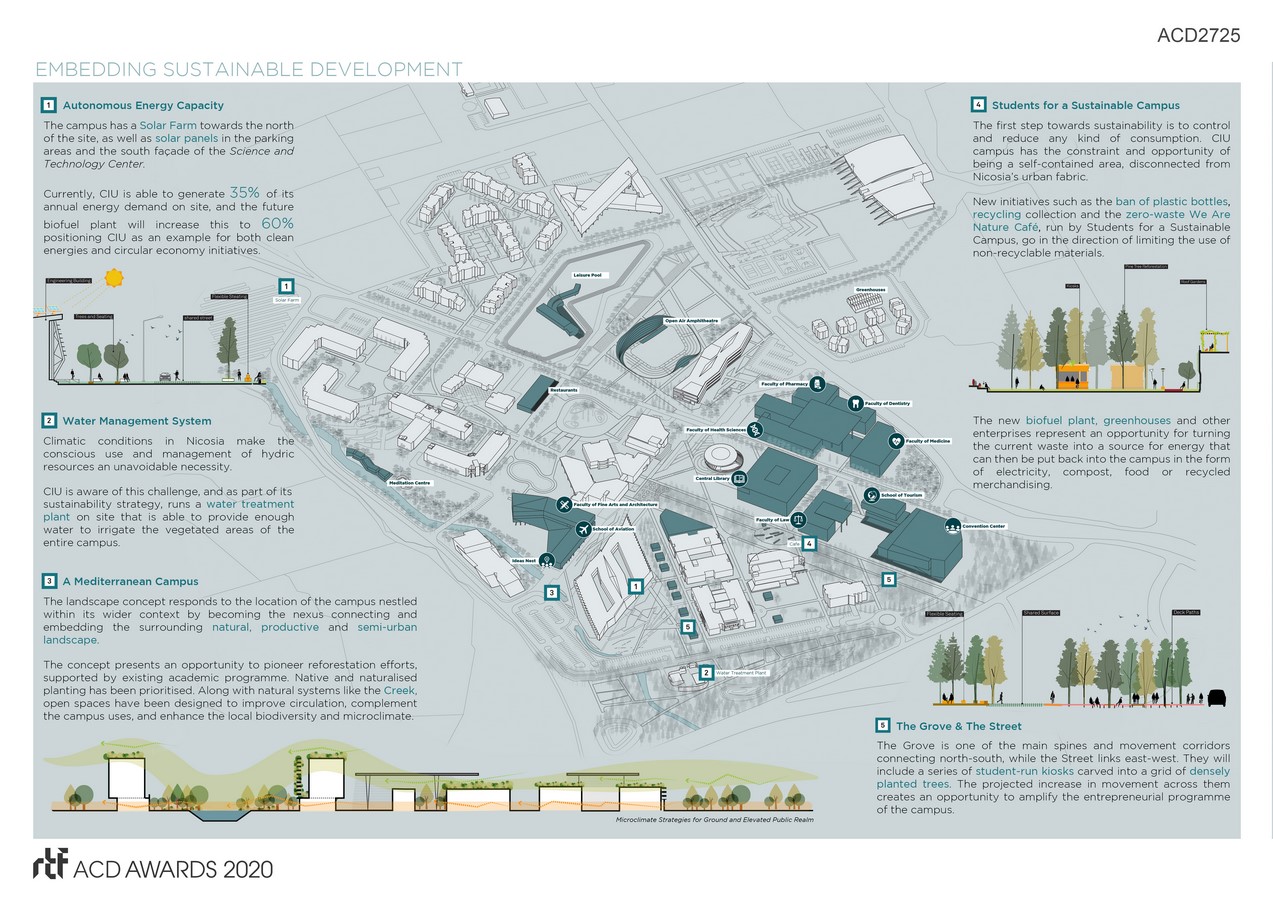 The campus is located in an impressive setting, with beautiful views of the mountain range to the north and a watercourse along its west, bridging between a natural and semi-urban landscape. The hot, semi-arid climate of Nicosia makes microclimate engineering and the conscious use and management of resources a necessity. The sustainable systems devised for water, energy and waste management implemented by CIU position it as an exemplar model for both clean energy and circular economy initiatives, and enable students to engage in sustainability initiatives. We carried out an in-depth assessment of these systems and proposed guidelines and initiatives to ensure a continued sustainable future for the University.
