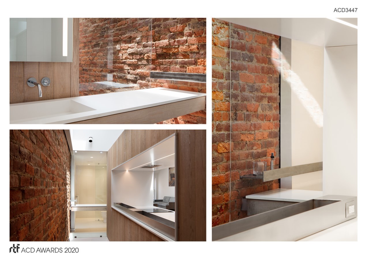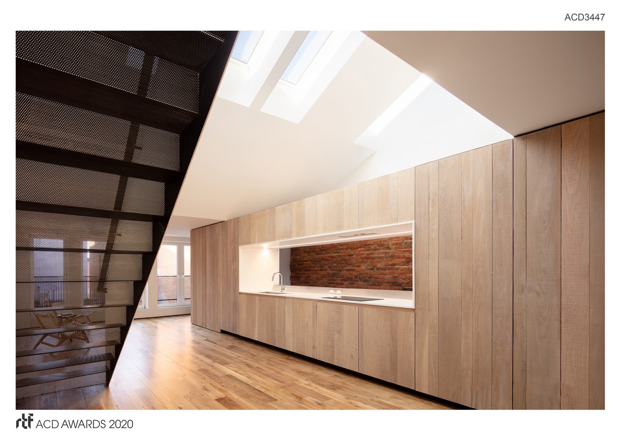 A window-like opening through the oak cabinet volume frames a view of the original brick masonry bearing walls offering a dramatic counterpoint of texture and color. The backsplash is completely open to a stair leading to the apartment vestibule below. In the kitchenโs opening, a low-profile stainless steel utility trough with electrical outlets runs along the edge of the counter. Functional and durable stainless-steel accessories for the kitchen and bath are custom-fabricated locally.
