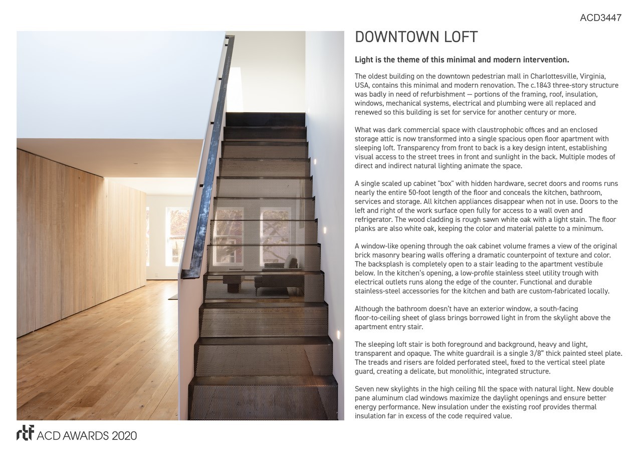 The oldest building on the downtown pedestrian mall in Charlottesville, Virginia, USA, contains this minimal and modern renovation. The c.1843 three-story structure was badly in need of refurbishment โ portions of the framing, roof, insulation, windows, mechanical systems, electrical and plumbing were all replaced and renewed so this building is set for service for another century or more.