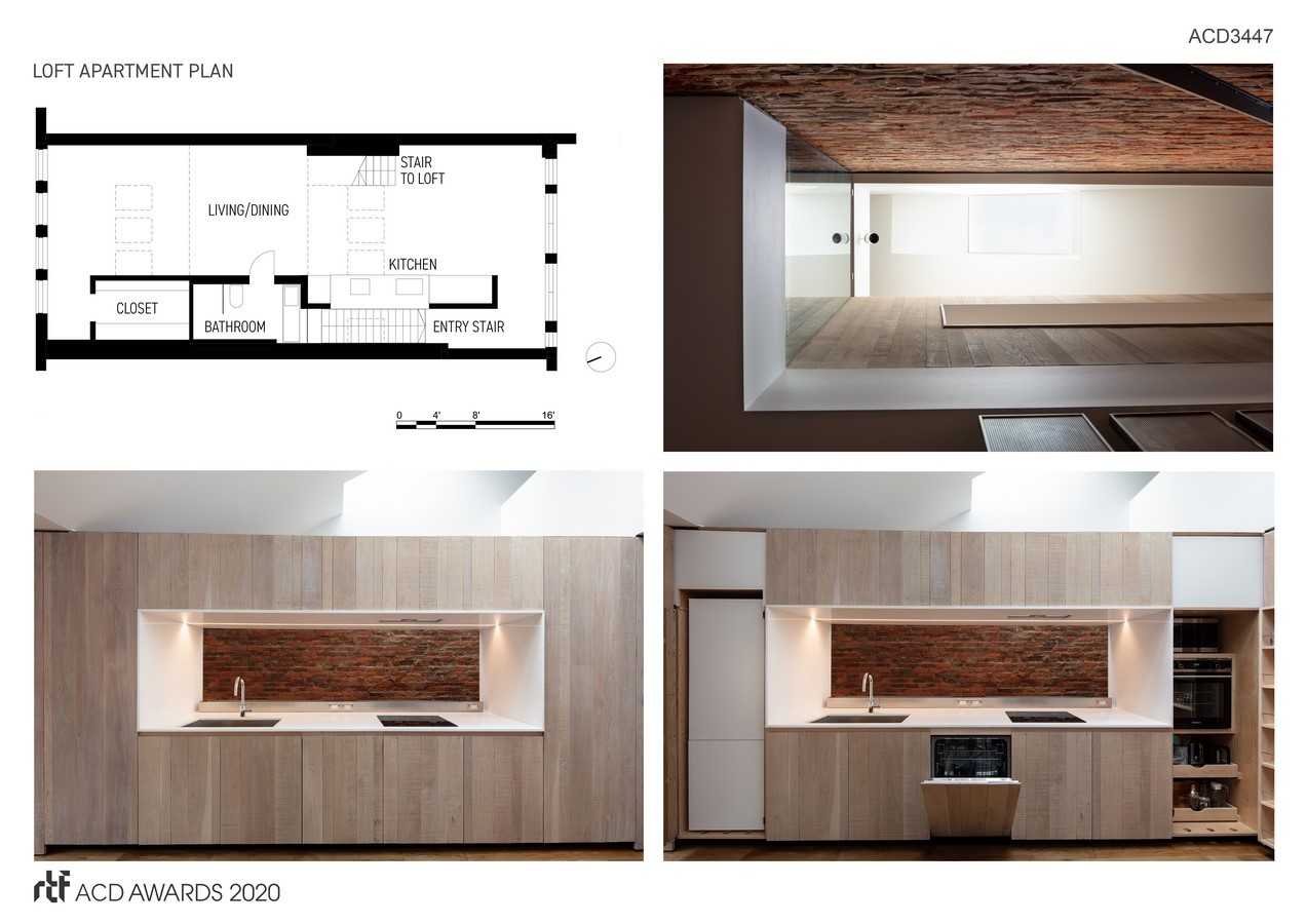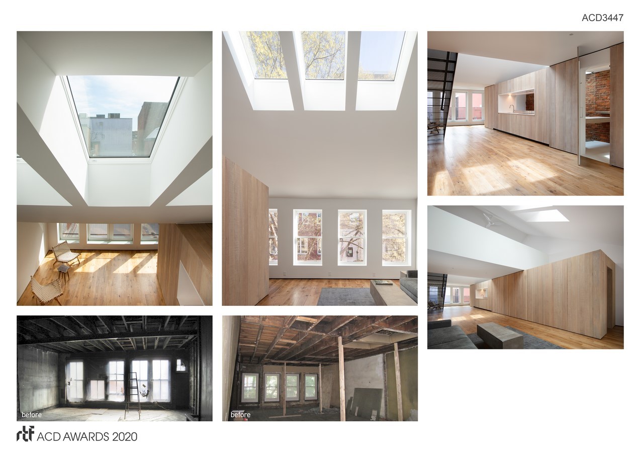 What was dark commercial space with claustrophobic offices and an enclosed storage attic is now transformed into a single spacious open floor apartment with sleeping loft. Transparency from front to back is a key design intent, establishing visual access to the street trees in front and sunlight in the back. Multiple modes of direct and indirect natural lighting animate the space.