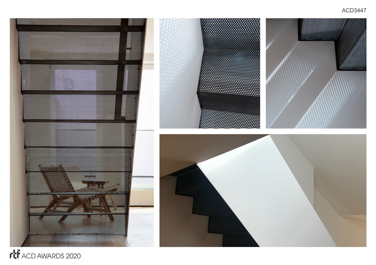 The sleeping loft stair is both foreground and background, heavy and light, transparent and opaque. The white guardrail is a single 3/8โ thick painted steel plate. The treads and risers are folded perforated steel, fixed to the vertical steel plate guard, creating a delicate, but monolithic, integrated structure.