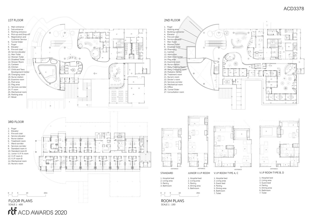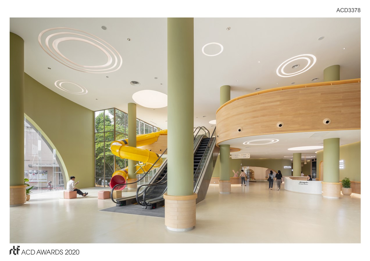 A scenario is designed and constructed near the pharmacy counter as a part of the layout of the ‘waiting area’, which embraces the ‘play space’. The program enables interactions between parents and children while allowing the adults to watch over their little ones during the wait. The use of indirect light with all the hallways of the hospital ensures that the young patients won’t be disturbed by the discomfort of excessive brightness.
