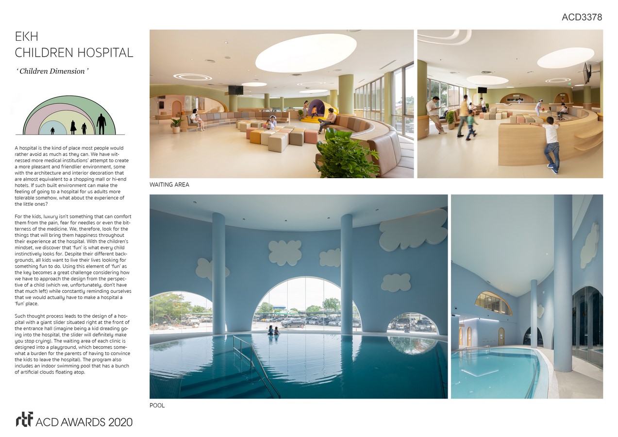 With children’s mindset, design approach of EKH CHILDREN HOSPITAL is to make the project a ‘fun’ place by incorporating many components of playground design. We use many elements as giant slider situated right at the front of the entrance hall, transforming waiting area of each clinic into a playground, indoor swimming pool with bunch of artificial clouds floating atop.