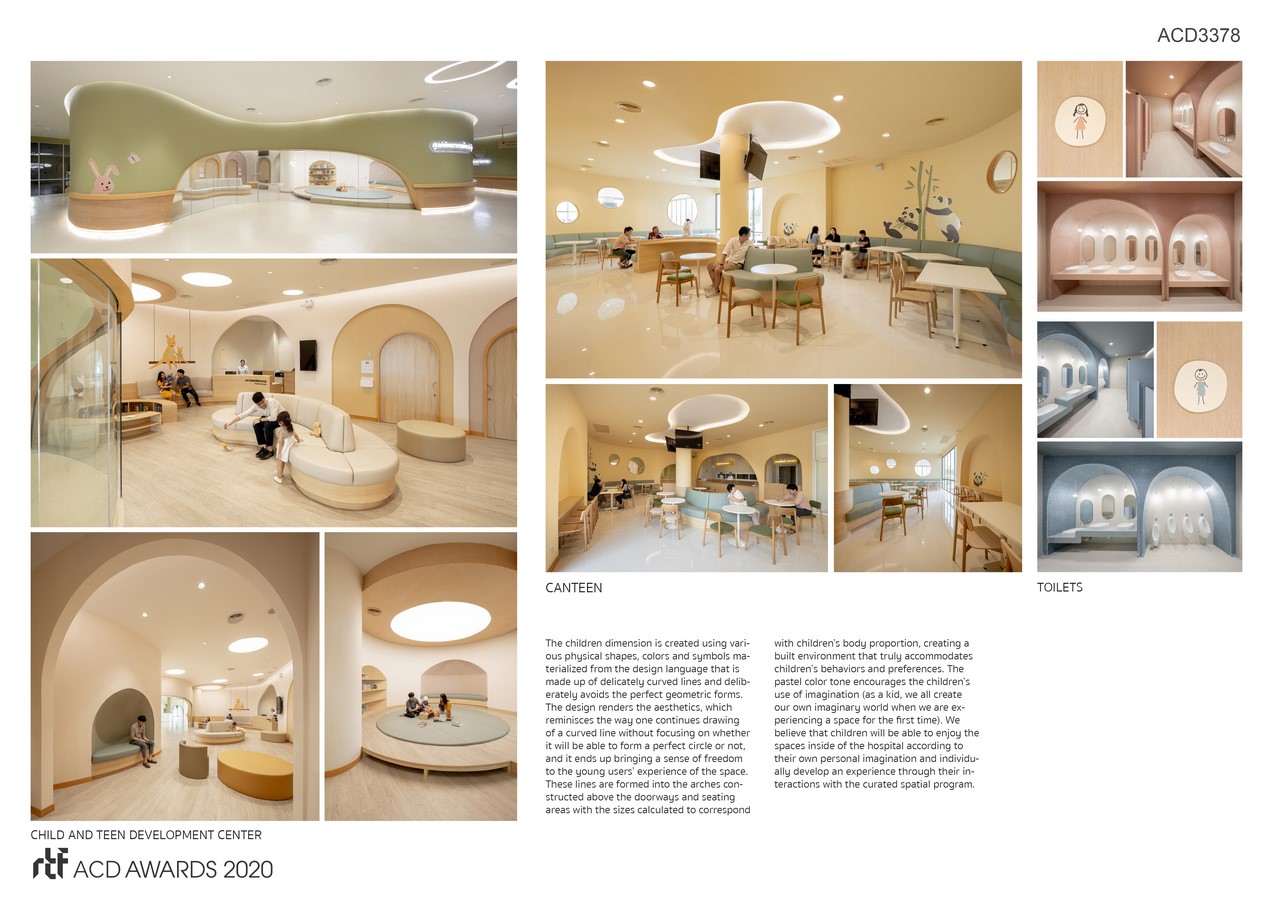 The children dimension is created using various physical shapes, colors and symbols materialized from the design language that is made up of delicately curved lines and deliberately avoids the perfect geometric forms. The design renders the aesthetics, which reminisces the way one continues drawing of a curved line without focusing on whether it will be able to form a perfect circle or not, and it ends up bringing a sense of freedom to the young users’ experience of the space. These lines are formed into the arches constructed above the doorways and seating areas with the sizes calculated to correspond with children’s body proportion, creating a built environment that truly accommodates children’s behaviors and preferences.